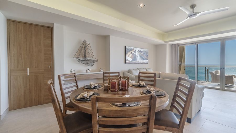 Condominium 902 has a large main room, home to a dining table for six, kitchen with full appliances, and a den living room space. All of it is bound by a wall of windows where the sliding glass doors access the large balcony.