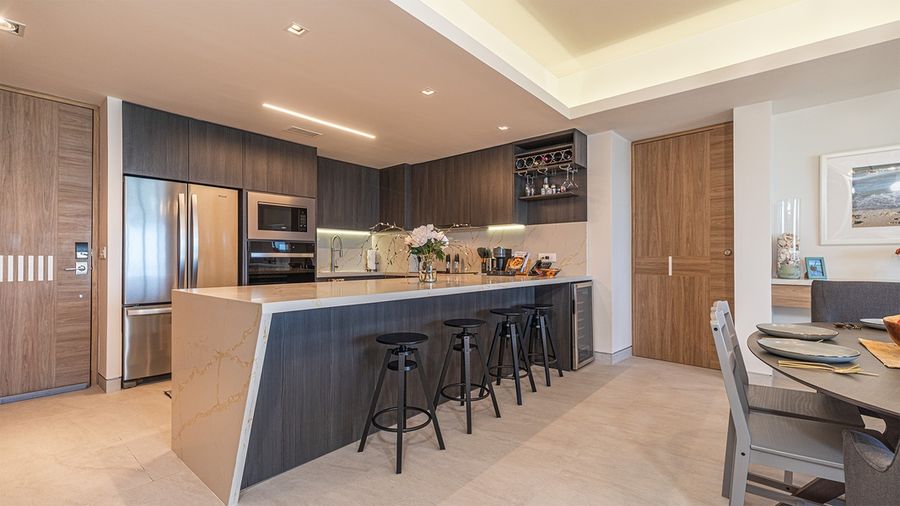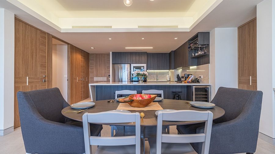 The main living room space invites you in with a well appointed living room. It contains a sofa and easy chair, along with a TV side board, and coffee table. Adjacent is the stylish dining table for six. The grand kitchen offers full stainless steel appliances, contemporary finished cabinets, along with a full array of kitchenware as well as small appliances The kitchen counter presents a large surface set with bar stools. A separate space houses the washer and dryer, along with a sink.