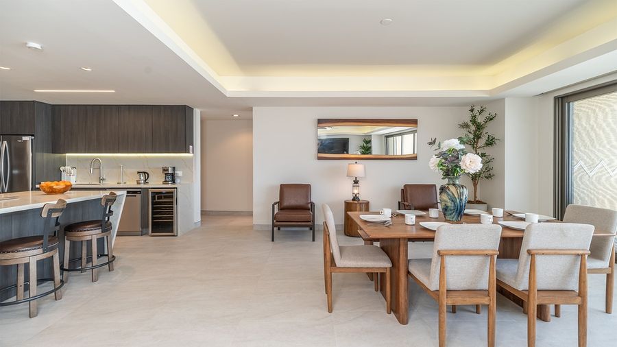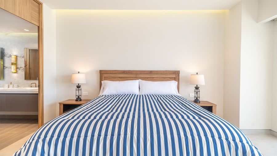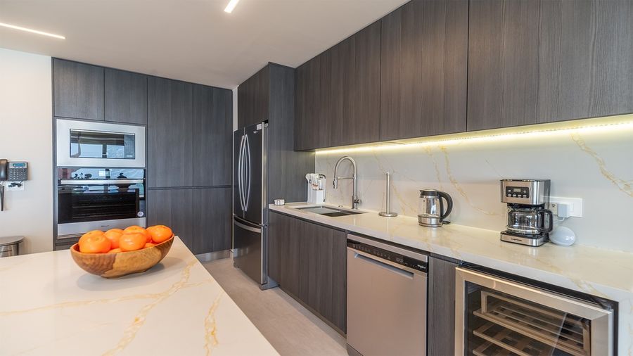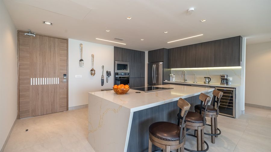 The master suite has a king bed, 70” TV and balcony access; the second bedroom offers a queen bed and 50” TV; the third has two twin beds and a 50” TV. All bedrooms feature luxurious bathrooms and generous closets.