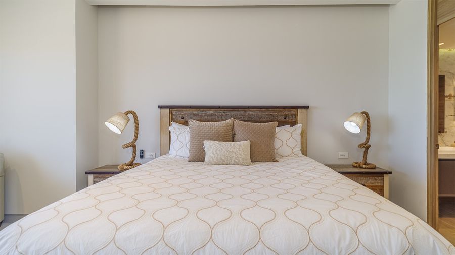 One bedroom at the Sonoran Start Resort. Right on the main city beach, this newest of Resorts gets high marks for its massive beachfront area with pools, grassy lawns, a lazy river, aqua bar, and more.