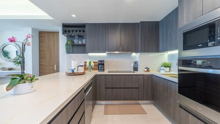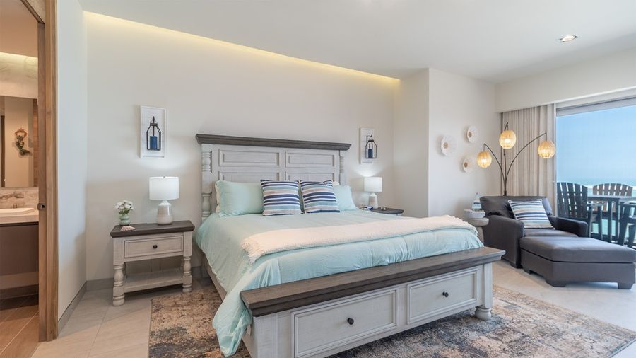 This condo presents a spacious bedroom suite where you can close the door and leave the world behind. An extra comfortable king sized is matched with a chair and ottoman, wall mounted TV, and a connected complete bathroom. The twin sink vanity is crowned with custom lighting and fixtures, and a separate walk in closet really sets this space apart. The walk in shower is large and elegant.