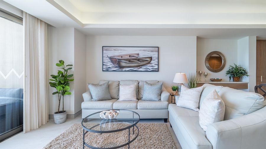 The living room offers double sofas and a wall mounted TV. A comfortable chair and ottoman sit near the balcony access sliding glass doors. Enjoy out of this world views for the balcony, set with a raised dining table for four, and intimate padded chairs as well.