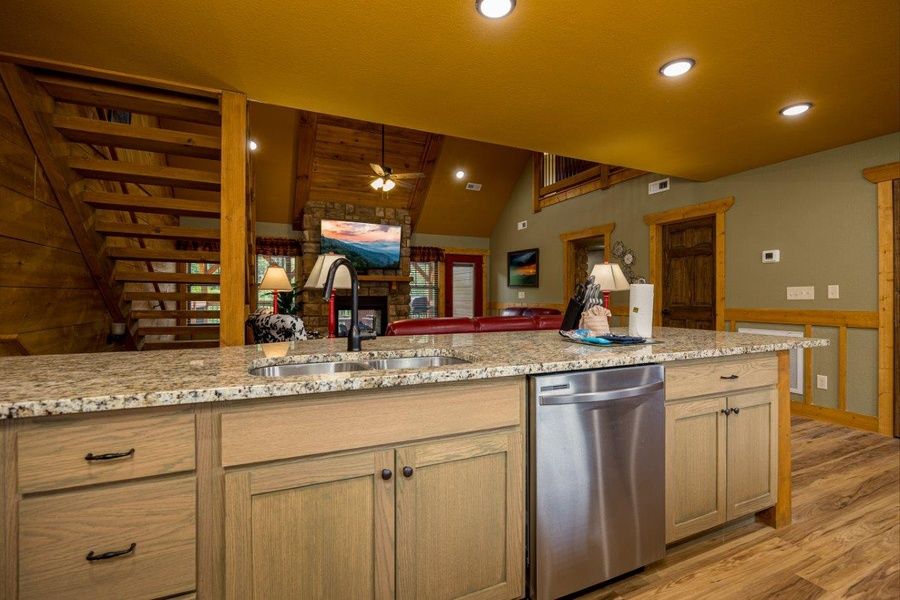 Each bedroom is thoughtfully designed with your comfort in mind, featuring king-sized beds, ensuite bathrooms, and contemporary furnishings. The great room serves as a stunning centerpiece with its double-sided stone fireplace, high vaulted ceilings, and a large flat-screen TV, creating a cozy yet grand atmosphere ideal for gatherings. The fully equipped kitchen is a culinary enthusiast's dream, complete with granite countertops, stainless steel appliances, and a breakfast bar, providing everything you need to craft gourmet meals.