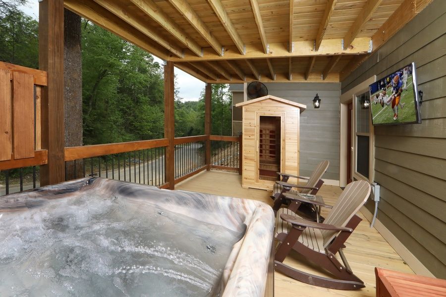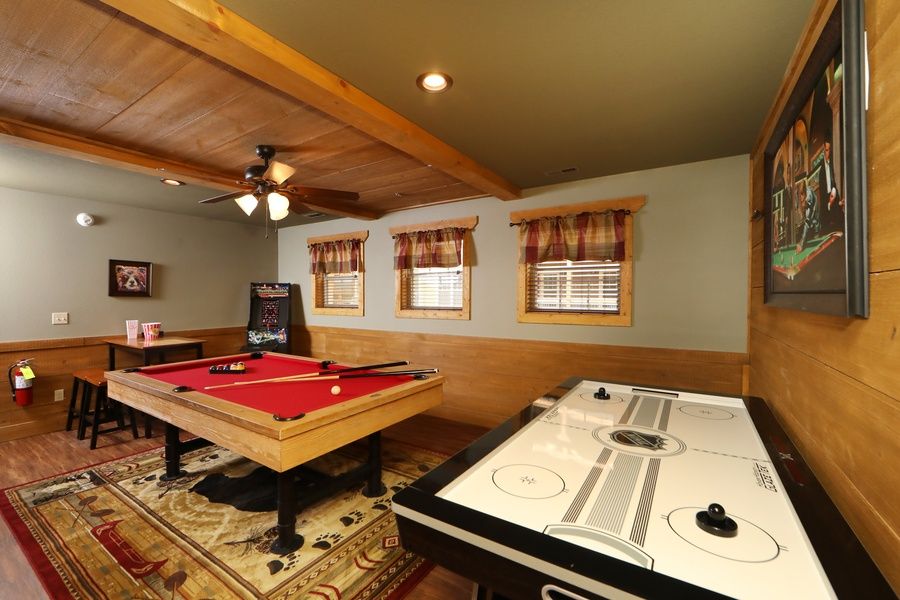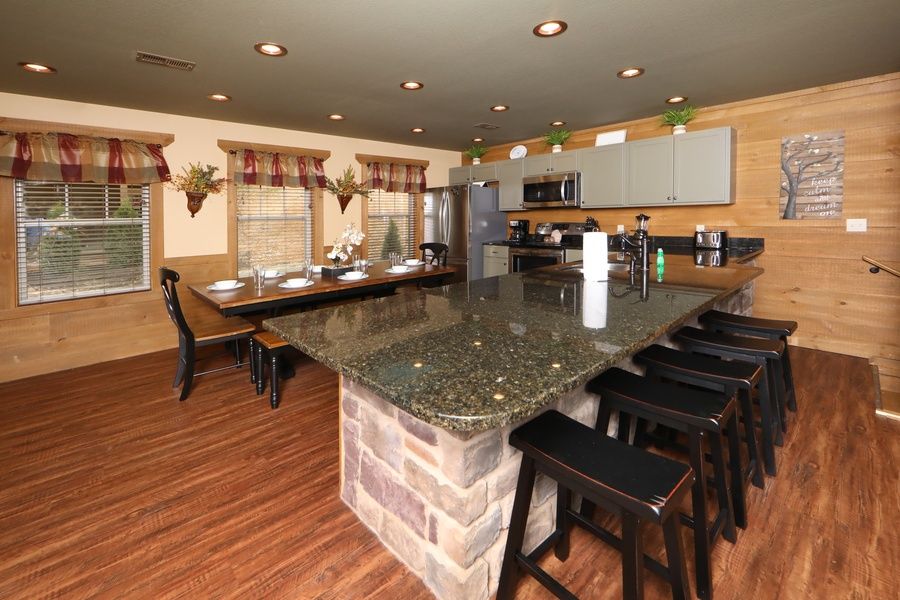 Head Over Hills is designed to cater to your every need with an array of premium amenities. Immerse yourself in a cinematic experience in the dedicated theater room, complete with an 86-inch TV. Engage in friendly competition with a game of pool or air hockey, or relax in the hot tub while enjoying the peaceful mountain vistas. For those seeking a touch of wellness, the private sauna offers a perfect retreat. The fully-equipped kitchen, with its stainless steel appliances and elegant granite countertops, is a chef's delight, whether you're crafting a quick breakfast or a gourmet dinner.