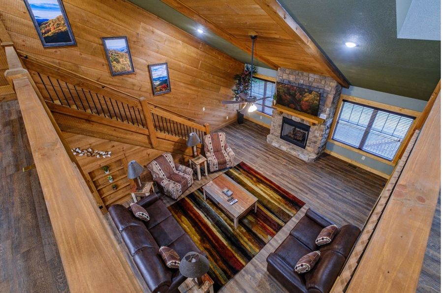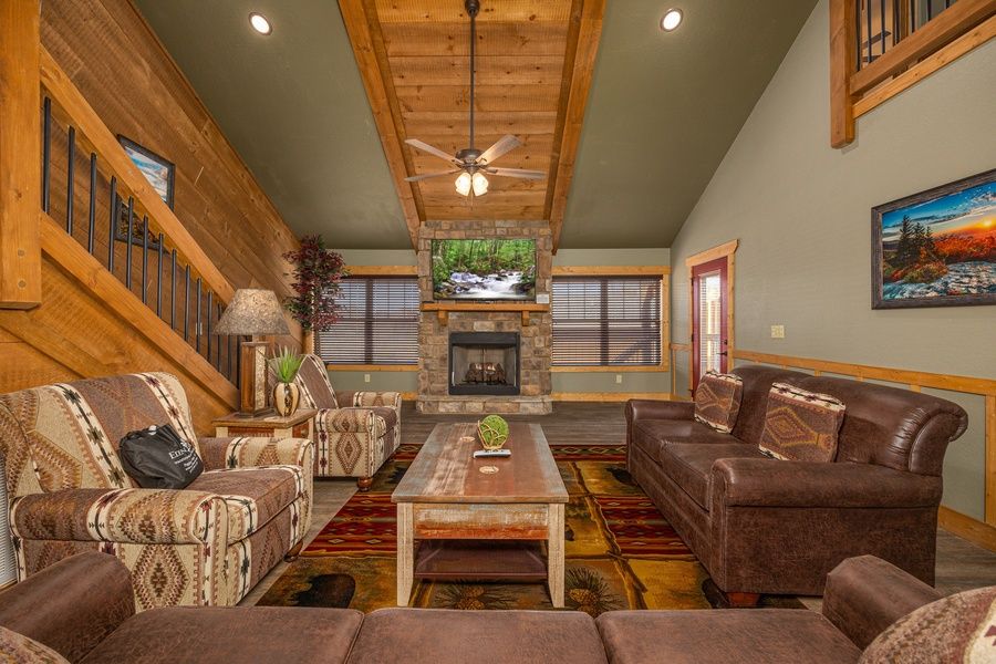 Step into the spacious, elegantly designed great room, where rustic elegance meets laid-back luxury. The living area, complete with a cozy leather sofa, love seat, and two armchairs, faces a stone fireplace and large HDTV, creating the perfect atmosphere for family movie nights or board games around the wood plank coffee table.