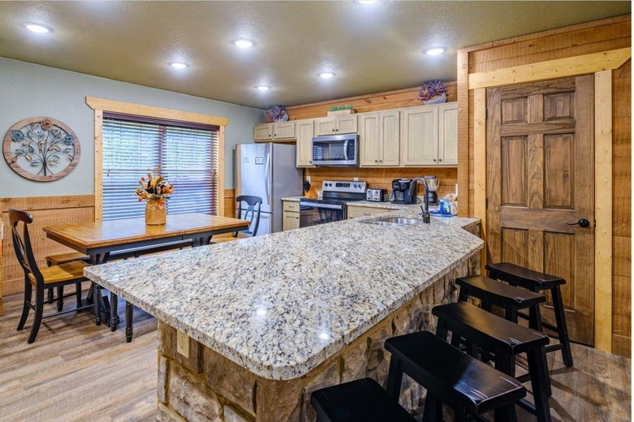 The open-concept kitchen boasts a granite-topped peninsula bar with casual seating and a farmhouse-style dining table. Premium stainless steel appliances, including an electric range, microwave, refrigerator, and dishwasher, are complemented by moss green cabinets. This fully-equipped kitchen is ready for everything from breakfast before a day on the trails to a special family dinner.