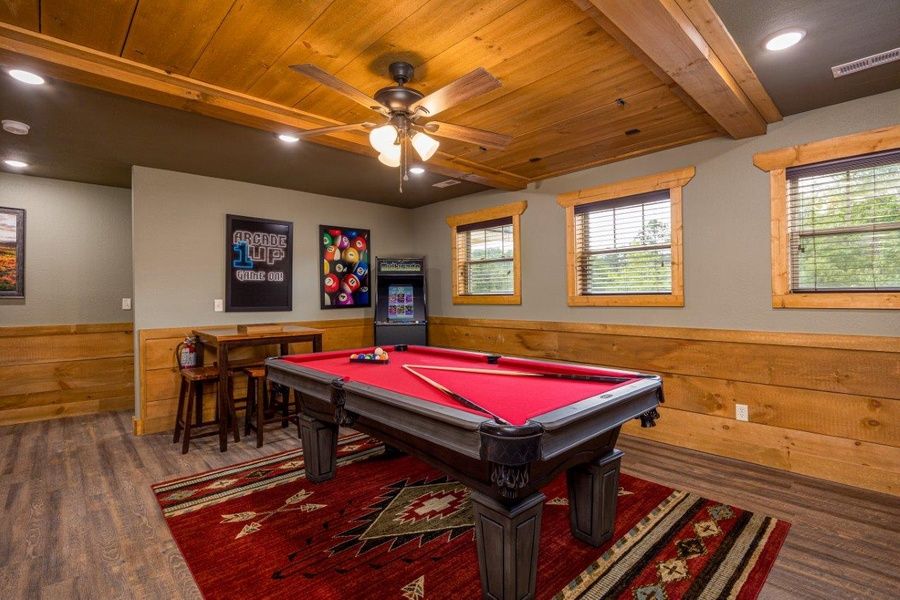 Game room with pool table, air hockey, and a multicade arcade system.