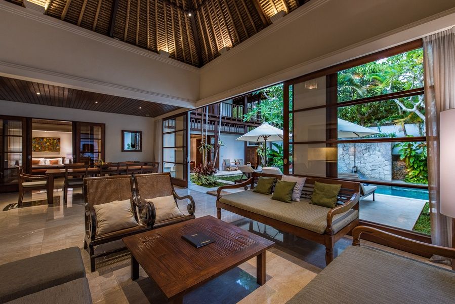 The living room features a high vaulted, traditional rooftop, glass doors that slide open to the garden and a natural interior design, ruled by teak wood and carefully selected pieces of art. The design is minimalistic and very elegant. The living space is fully air-conditioned, and having a nice and cool hideout to dine with family and watch movies on the sofa is no luxury on tropical islands like Bali. In fact, you get to enjoy the best of both; AC when needed and for the rest of the time, you can live the tropical life, jumping straight into the pool from the sofa, so to speak. Villa Senada features an 8-seater timber dining table, a lounge corner with sofas, armchairs, a coffee table and a TV tucked away in a timber cabinet and there is a spacious, fully equipped kitchen—perfect for families, indeed!