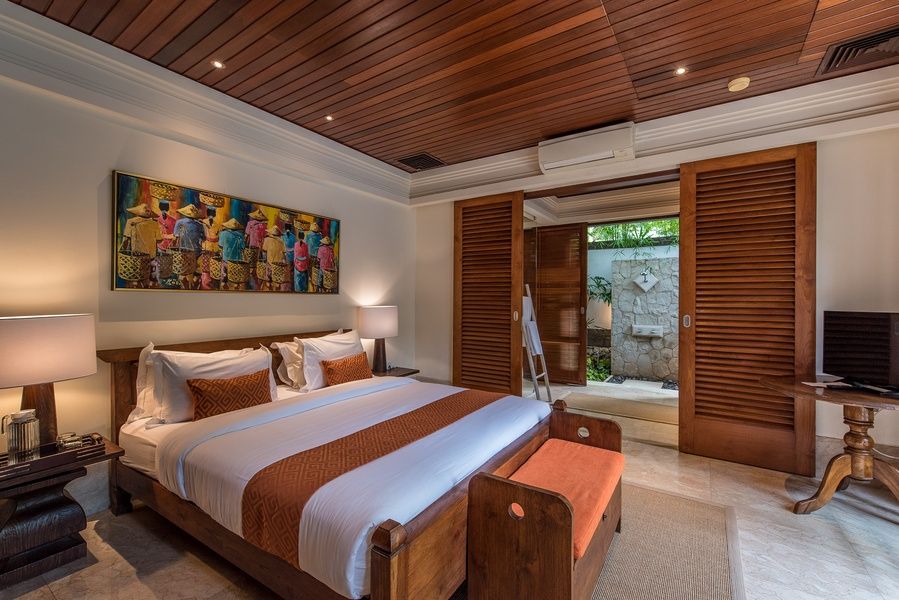 Villa Senada houses 4 bedrooms. The master suite resides up on the first floor of the double-storey guesthouse pavilion, adjoined to a balcony. This spacious bedroom is furnished with a romantic canopied king-size four-poster bed, a lounge bed and a TV. There is a walkthrough dressing room featuring large timber wardrobe closets and it leads to the en-suite bathroom where you can enjoy a hot shower or a bath. The other 3 bedrooms are also fully air-conditioned and fitted with king-size beds. The en-suite bathrooms boast tropical open-air showers with hot and cold water. Who wouldn’t want to shower beneath a starlit sky? It’s wonderful!