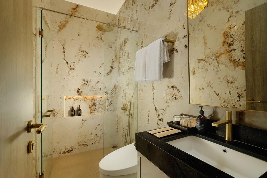 Every suite in Villa Kalem Uluwatu embodies sophistication. The master bedroom, set on the second floor, is a grand retreat with a king bed, two additional sliding twin beds, a walk-in wardrobe, and a private balcony overlooking the ocean. Its ensuite bathroom features a double vanity, an opulent bathtub, and a rainfall shower, offering the ultimate relaxation. Two additional queen-bed suites on the same level provide serene hideaways—one with a landscape view and the other designed for cozy privacy without an outdoor view.