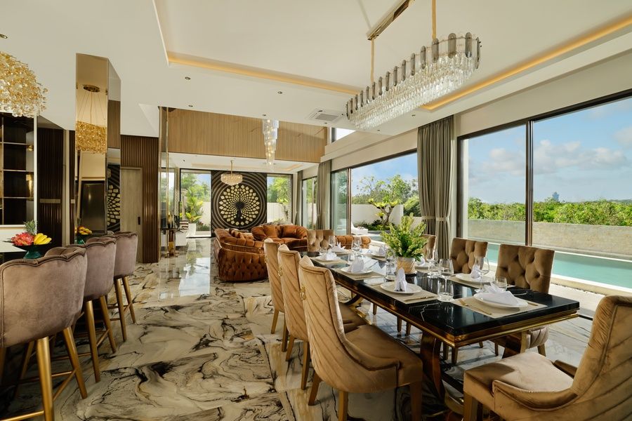 The main living area features plush sofas, a 70-inch Smart TV, a dining area for eight, and a fully equipped kitchen. Floor-to-ceiling windows open to the private pool and sunken lounge, creating a seamless indoor-outdoor experience. A plunge pool sits above the main swimming pool, adding a unique layered water feature.