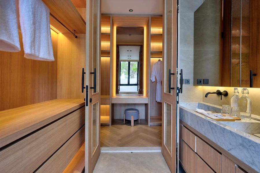 Each bedroom is equipped with air-conditioning, smart TVs, generous wardrobe space, and en-suite bathrooms. The bathrooms vary slightly in layout but include walk-in showers, bathtubs in select rooms, and his-and-hers sinks in several suites. The master bedroom also includes a private lounge space that can double as a shared workspace or reading area.