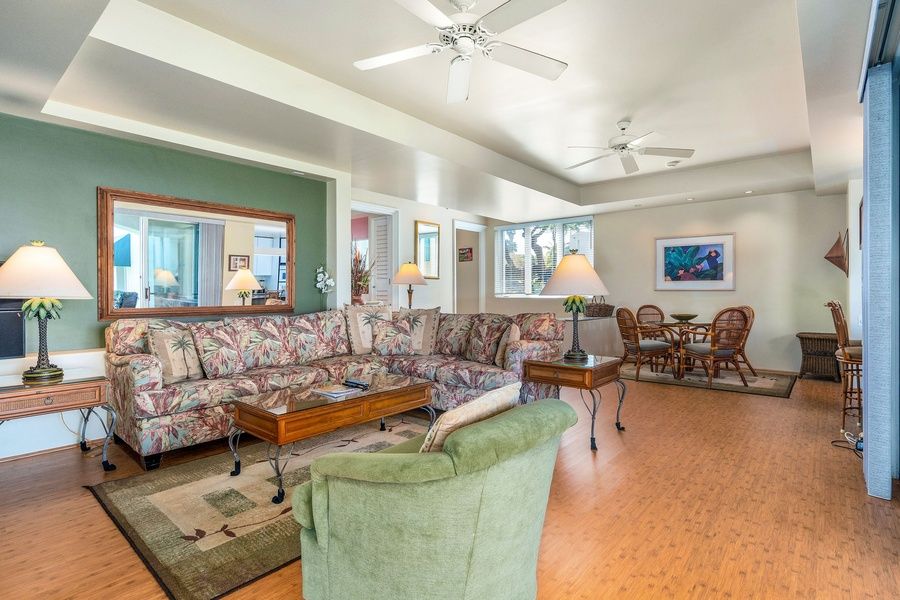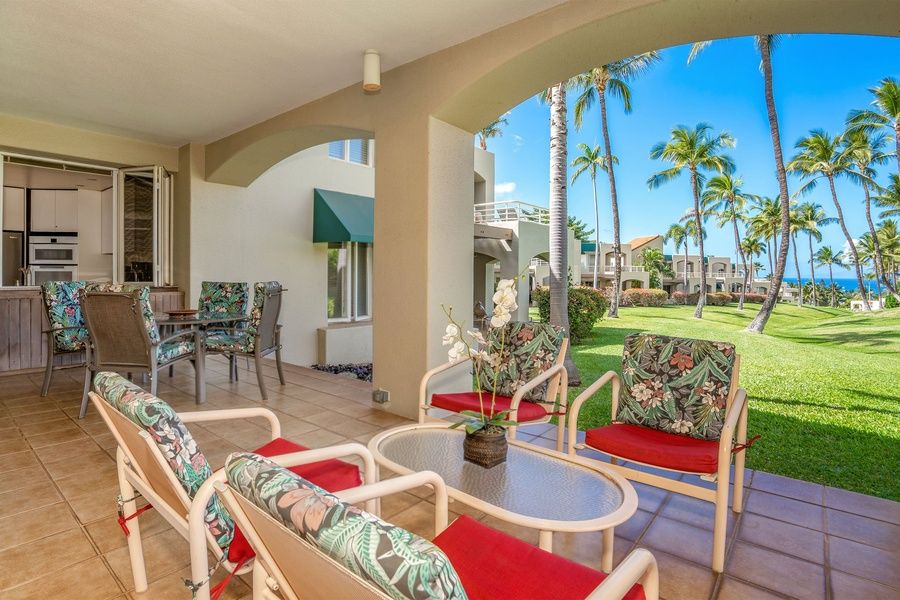 Step out onto your private lanai to enjoy garden views and gentle island breezes - the perfect backdrop for morning coffee or an evening glass of wine. The inviting living space flows easily to outdoor seating, extending your relaxation area and capturing the essence of Maui's laid‑back lifestyle.