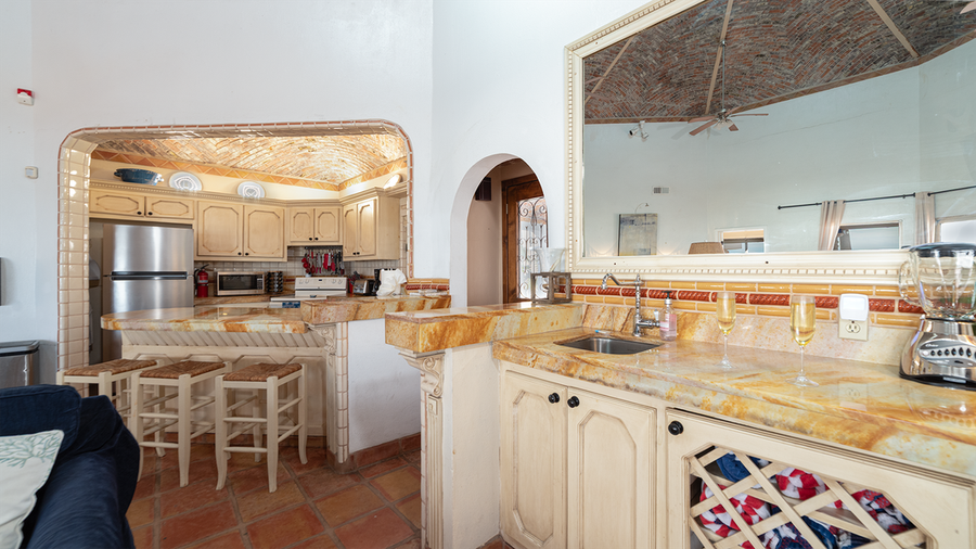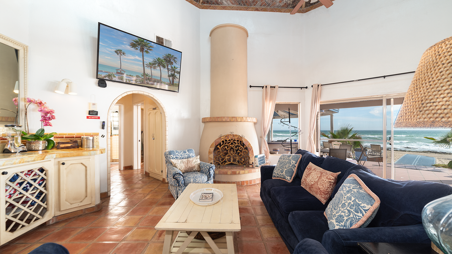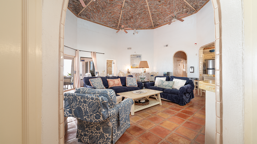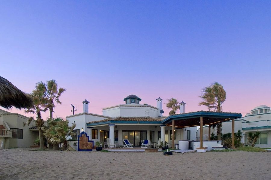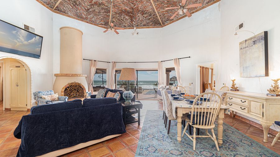 Five bedroom, five bath Playa Sin Fin is a traditional style Rocky Point beach house. There is a large patio that spills onto the sand of Las Conchas Beach, along with a walled front yard. The main room has a high ceiling topped by a bricked dome. The complete kitchen and all of the bedroom/bathrooms radiate out from this central space.