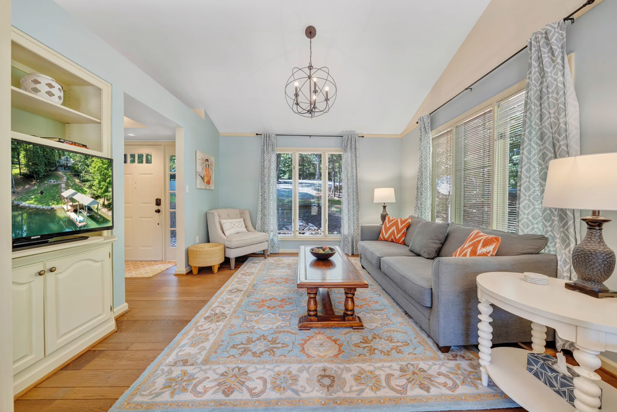 Step inside to soaring ceilings, abundant natural light, and serene water views that greet you from the main living areas. The comfortable furnishings, warm design, and spacious layout make it easy to relax, recharge, and settle into lake life. Enjoy memorable meals on the upper or lower decks, unwind with a good book, or gather in the game room for friendly fun.