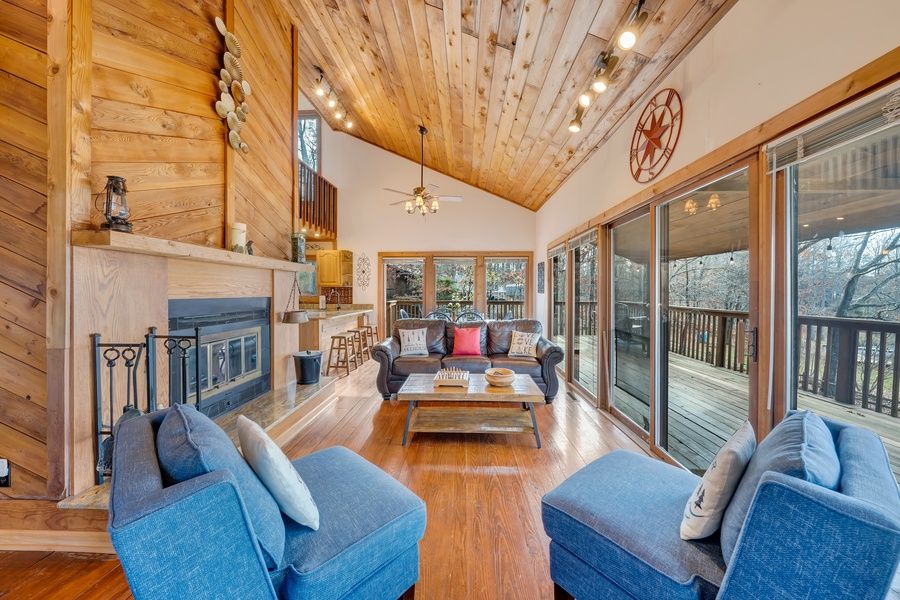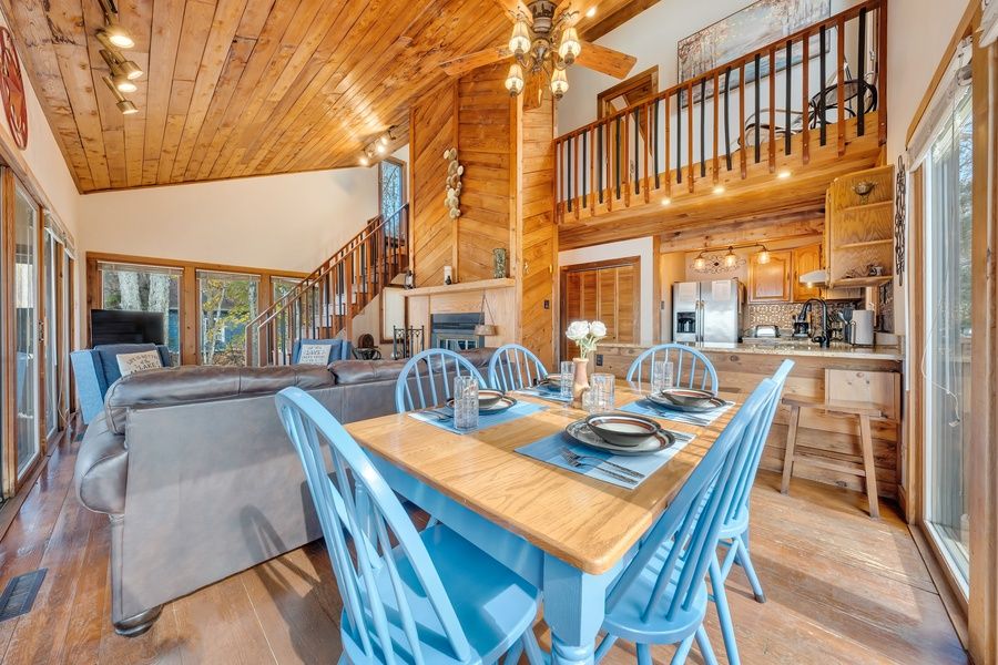 Step inside to warm, inviting living and dining spaces that make gathering easy. Large windows showcase gorgeous lake and sunset views, while comfortable furnishings and thoughtful touches ensure a relaxing stay for all.