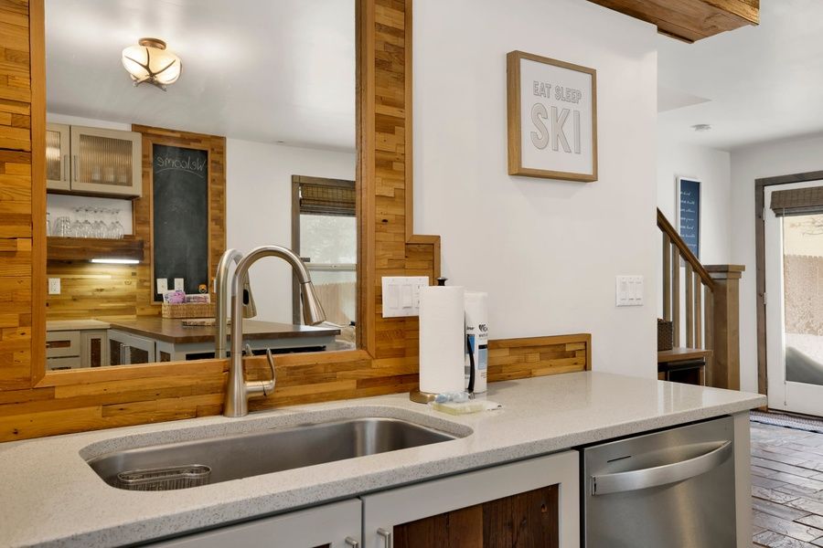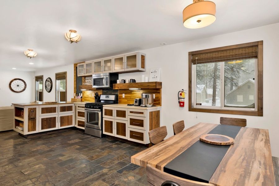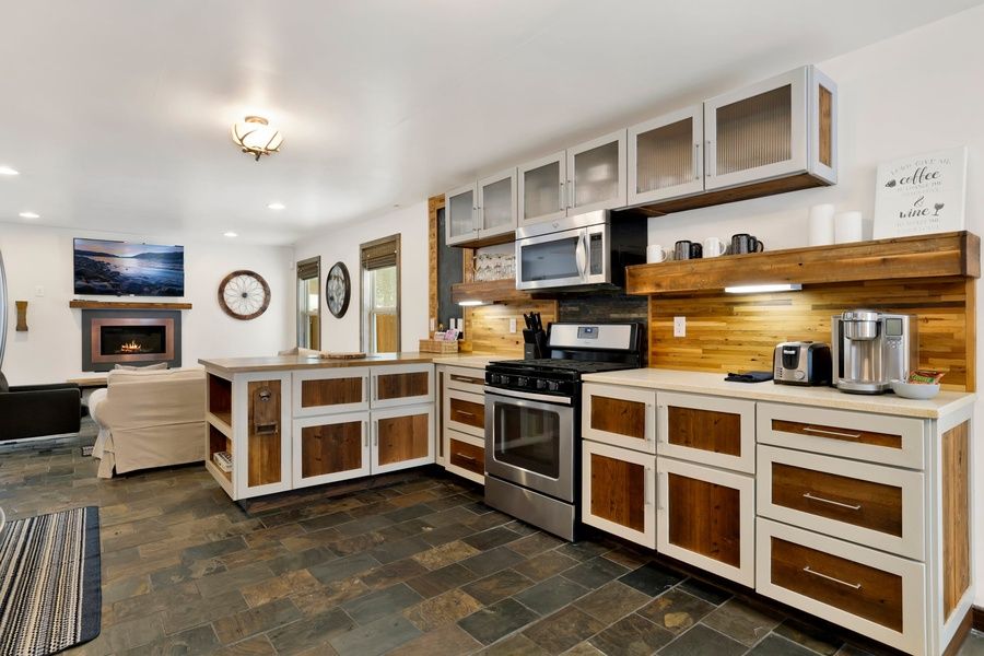 Inside, the open and inviting living space features slate floors, large picture windows, and a cozy electric fireplace perfect for unwinding after a day of adventure. Plush seating, high-speed WiFi, and central forced heating provide comfort year-round, while a stacked washer and dryer make longer stays easy and convenient. The centrally located kitchen is fully equipped with custom oak cabinetry, butcher-block accents, and stainless-steel appliances, flowing seamlessly into the dining area for relaxed meals and shared moments.