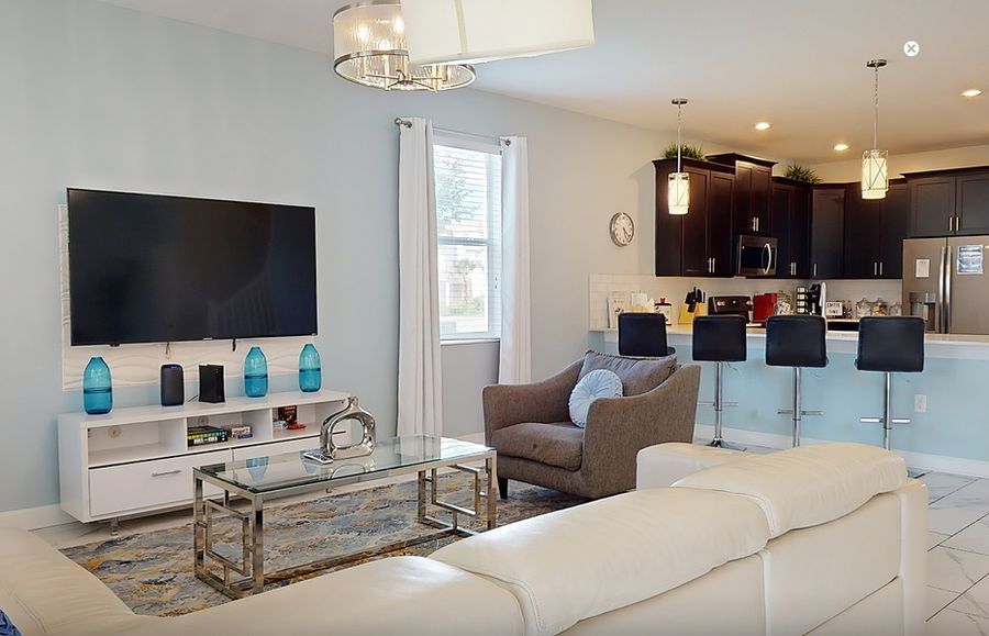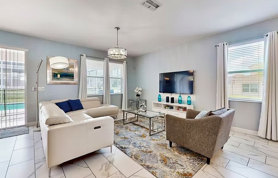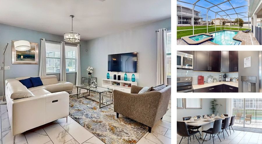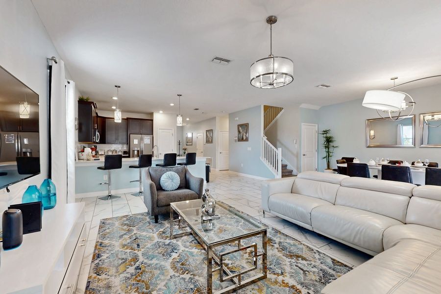 Get a taste of the Florida lifestyle and bring the whole family along to this fantastic home boasting plenty of space, activities, and comforts that will make your next vacation a blast! Whether you are visiting to check out the famous theme parks nearby, or simply want to kick back and enjoy some time away from the everyday hustle and bustle, this will be the perfect home base. The first floor will be the hub for gathering with loved ones, as the open layout will allow everyone to mingle from room to room with ease as the chef of the group whips up something tasty in the beautiful full kitchen. Guests can gather in the living room complete with a sectional sofa and mounted flatscreen TV, at the dining table featuring plush leather chairs, or at the breakfast bar to socialize with the cook. Step through the sliding glass doors and you will find the stunning backyard as well featuring a lanai, patio seating, a sparkling private pool and spa, and a gas grill for more casual summer cookouts. The game room in the garage and two bedrooms call the first floor home as well, one of which being the main suite with a large soaking tub in the ensuite bathroom.