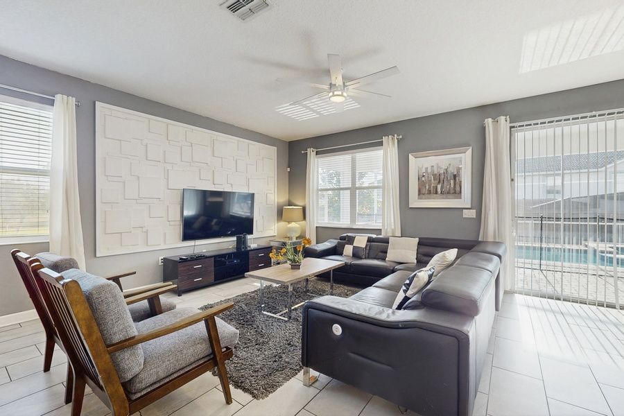 Beautifully designed and decorated in a polished, modern style, this corner home in the renowned ChampionsGate resort community has it all. With an open living area and nine bedrooms (each with its own flatscreen TV), this home provides plentiful space for rest, relaxation, and quality time with loved ones. Enjoy your very own outdoor pool and spa, a private in-home theater with a 120-inch projection screen, a game room with pool and Ping-Pong, and fantastic access to the resort's water park and other amenities at the Oasis Club down the street!