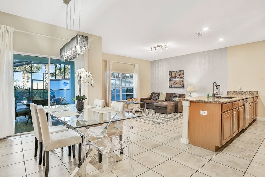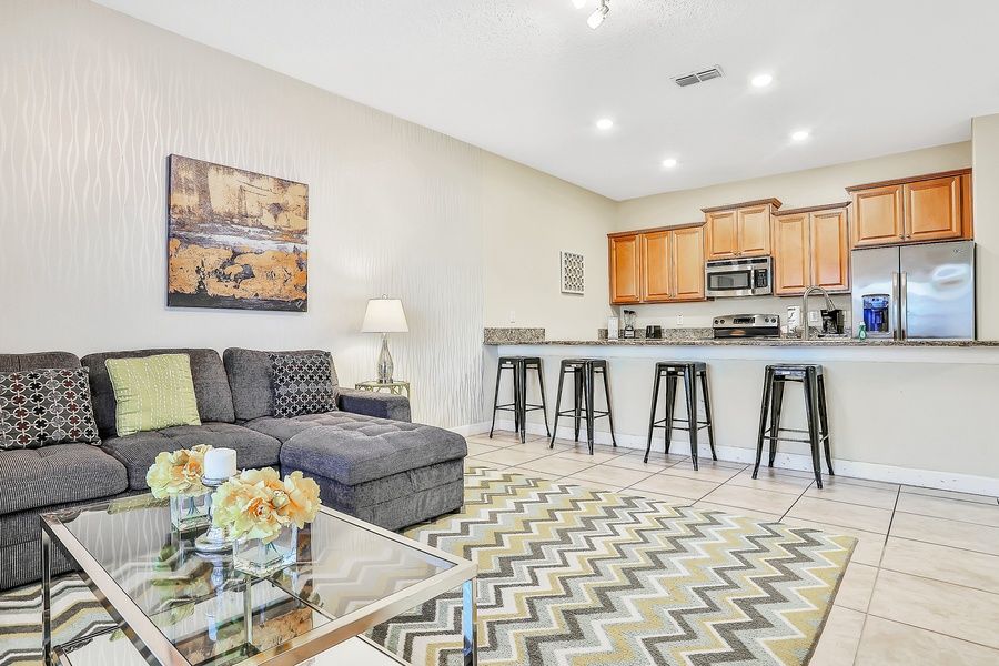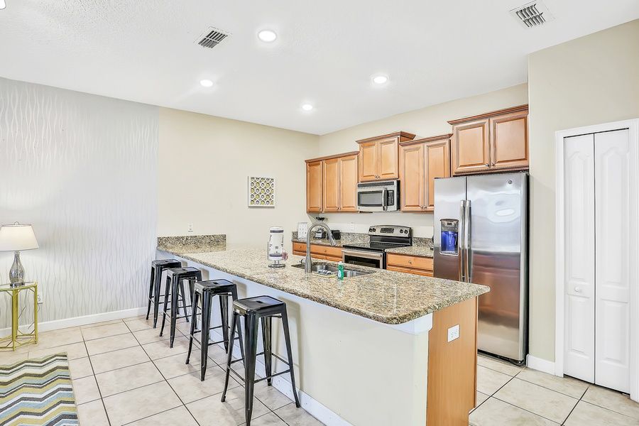Endless Magic is nothing but the perfect home base to experience a magical getaway near Walt Disney World! This two-story townhouse has four bedrooms and enough space to host an entire family, groups of friends, and couples. Once you book this gem, you and your loved ones will have access to the resort's Club House, which offers a Ping-Pong table, pool table, children's pool, lazy river, volleyball court, playground, and a fitness center. As soon as you set a foot inside, you will be greeted by a spacious open floor plan that seamlessly combines the kitchen, dining area, and living room. From here, you will also have access to the enclosed backyard, which hosts a private heated pool surrounded by a pool safety fence, two beach chairs, and an outdoor dining area for six by the pool. Let the kids and kids at heart enjoy a refreshing splash in the pool while the rest of the group hangs out and delight themselves with a homemade meal or fresh beverages. Back inside, the living room boasts a comfortable sectional right in front of a Smart TV with cable, offering endless entertainment when it's finally time to unwind and relax after a fun day out. The kitchen will be the chef's playground with all stainless steel appliances, and the dishwasher will make cleaning up so much easier. The dining table has enough space for six, but if you are in a mood for a quick meal on the go, the breakfast bar offers four more spaces. The first level additionally hosts the main bedroom with a flatscreen TV and a full bath. The other three bedrooms, along with two full bathrooms, are located upstairs. There is another primary suite with a flatscreen TV and an en suite bath. The other two bedrooms (each with a flatscreen TV for added entertainment) share a full bathroom down the hall.
