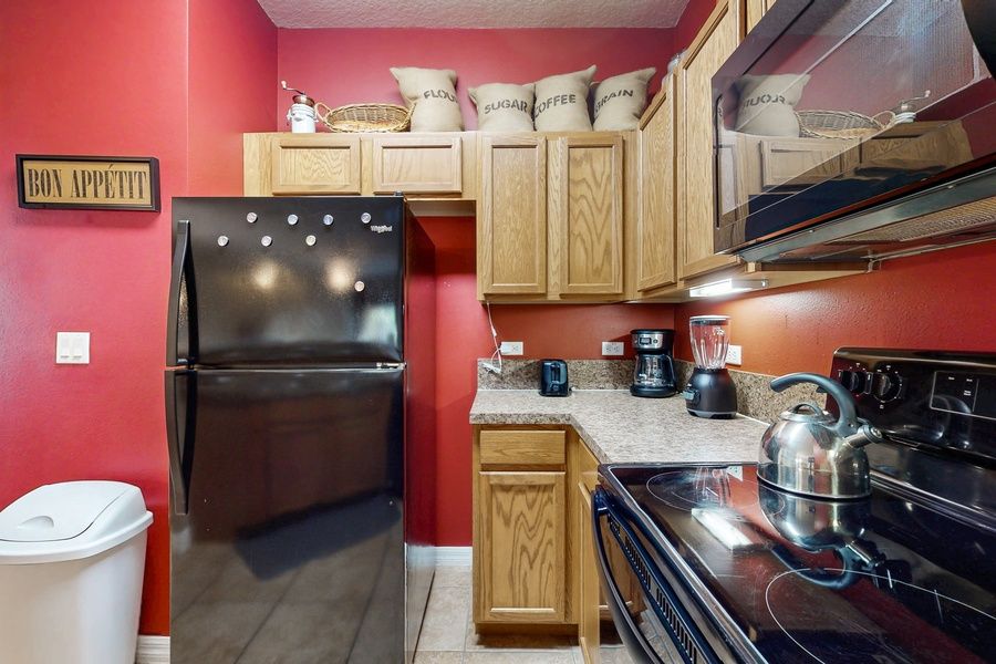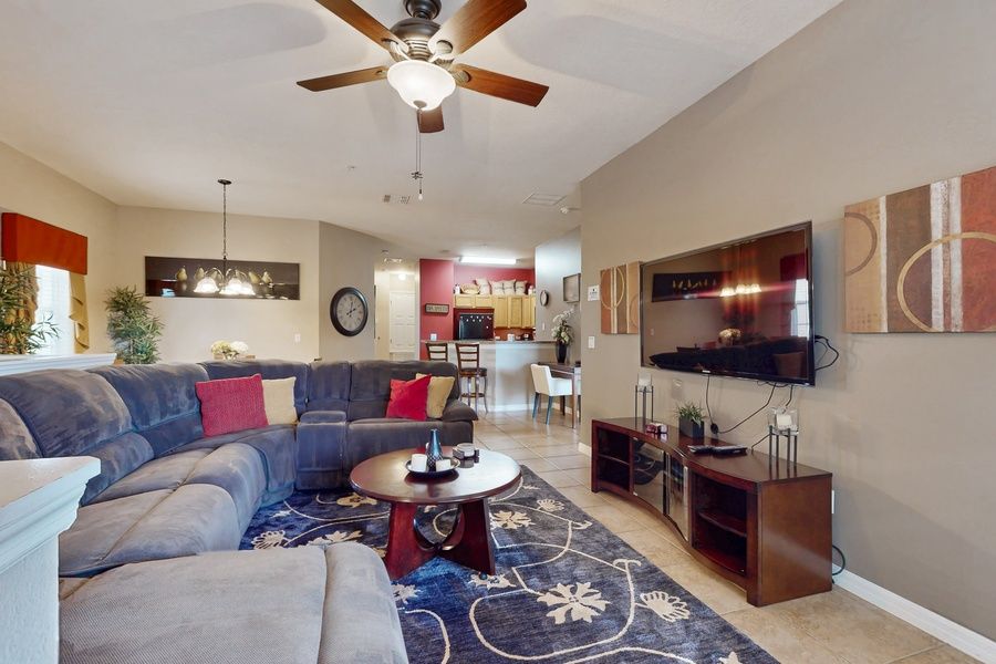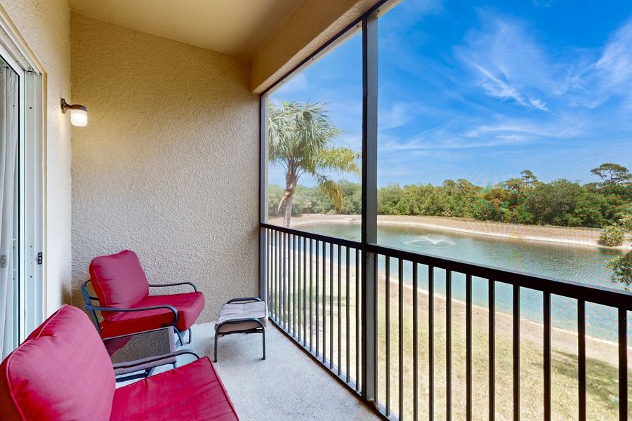 Disappear into comfort at this well-designed condo! As you come up the stairs, you can settle in on the extra-large corner sofa or directly get some fresh air out on the private balcony. A view of the local lake will certainly put your mind at ease! The full kitchen includes full-size appliances (including a dishwasher) and a breakfast bar long enough for two guests to enjoy a casual meal. Of course, everyone will be comfortable in central air conditioning all night. The main bedroom features a desk workspace perfect for remote work and schooling. Each bedroom includes a mounted flatscreen TV as well as a ceiling fan so that you can drift off in customized comfort. All guests can enjoy access to the shared pool, hot tub, tennis court, pickleball court, basketball court, gym, fishing pond, and playground during their stay.
