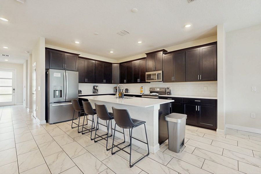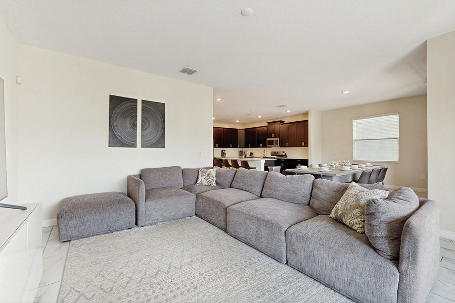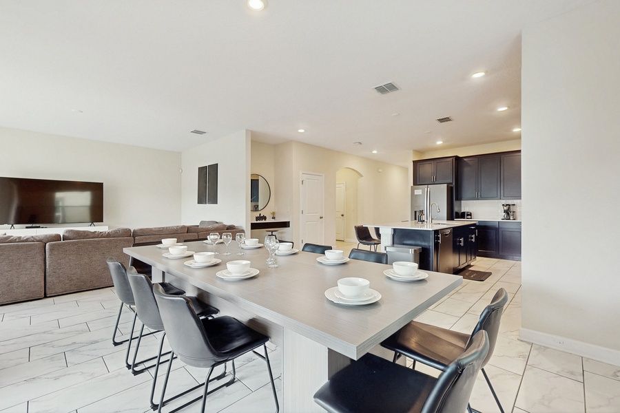 Inside, the villa boasts a movie room with an 82” Samsung TV and plush recliners, ideal for cozy movie nights. The main living area features a large sectional and a 75” TV, perfect for gathering with loved ones. The fully equipped kitchen is a chef's dream, complete with service for 16, a dining table for 6, and bar seating for 4, making it easy to prepare meals for your group.