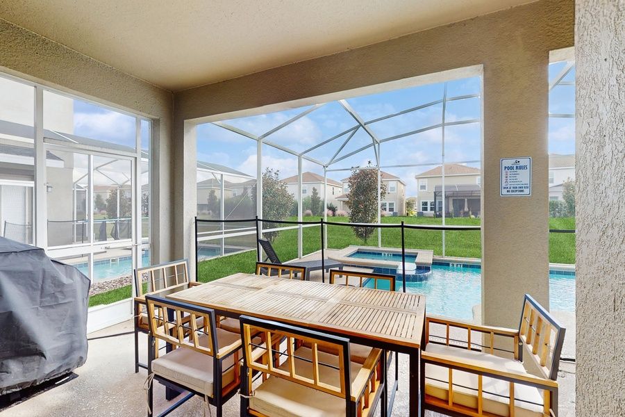 Step outside to your own private oasis featuring a screened-in pool and spillover spa, perfect for relaxing after a day of adventure. The outdoor area is equipped with sun loungers, a bistro set, and an outdoor dining table, all surrounded by lush greenery and no rear neighbors for added privacy. For families with young children, a child safety fence provides peace of mind.