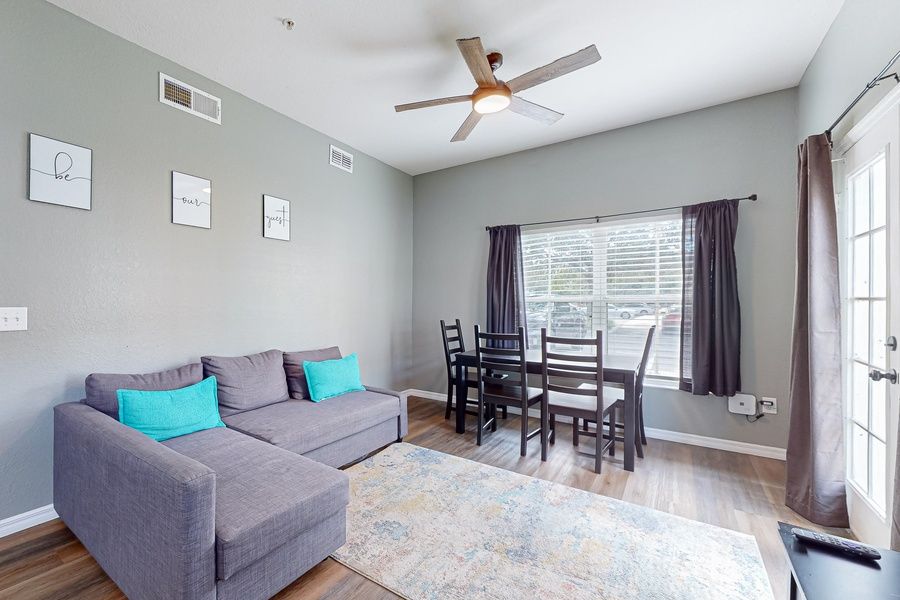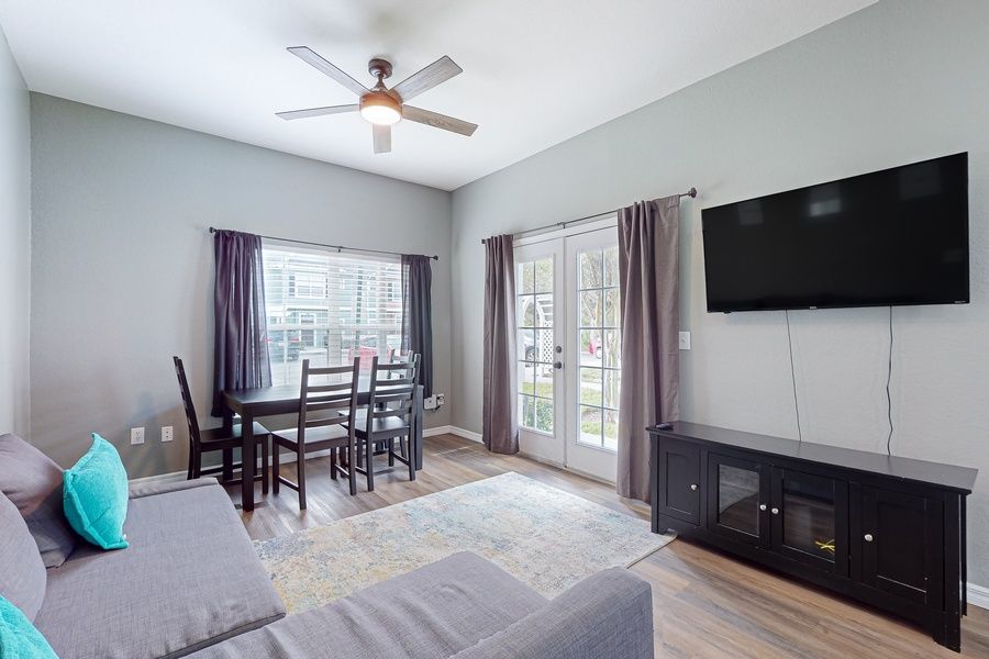 Entertainment awaits with a wealth of amenities, including Netflix streaming, TV, board games, a ping-pong table, pool table, and access to a tennis court and gym/fitness room. Take a dip in the heated pool or hot tub, or enjoy the vibrant atmosphere at the outdoor pool. The game room provides endless indoor fun, while central AC ensures a cool and refreshing stay.