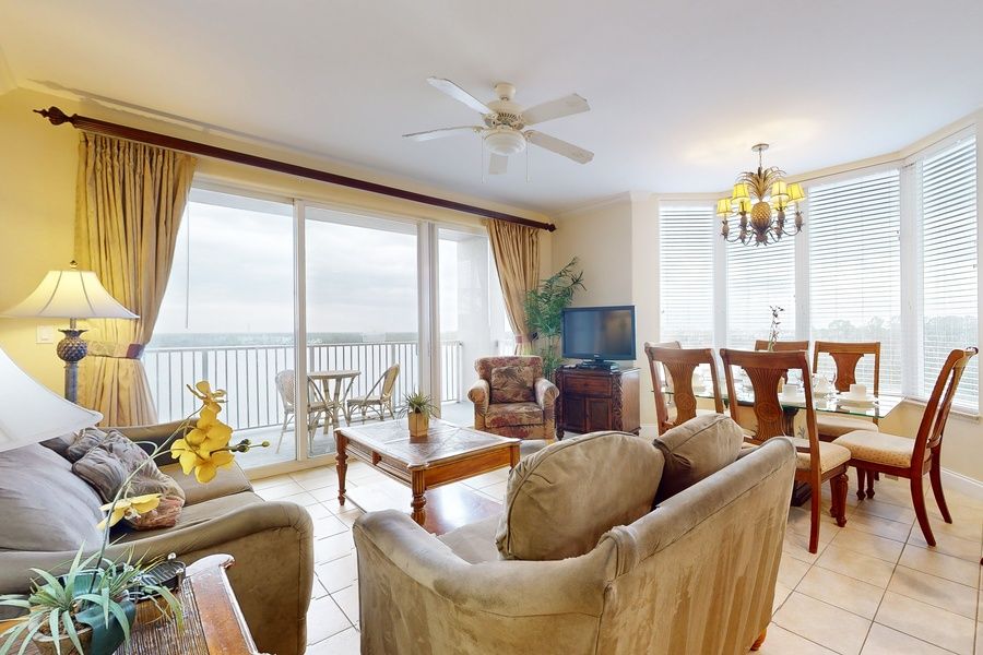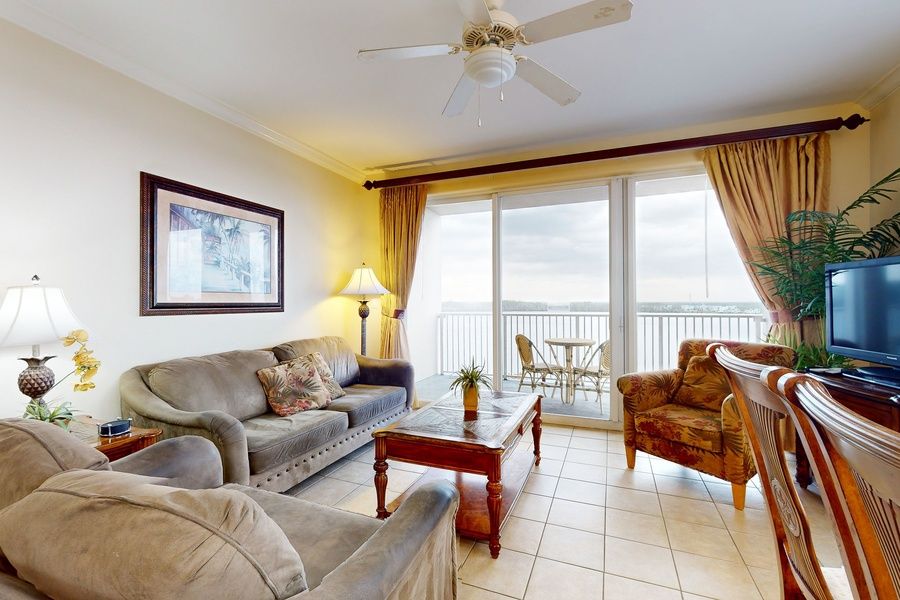 • Living Room: Sleeper sofa with gorgeous lake views and direct access to the main balcony