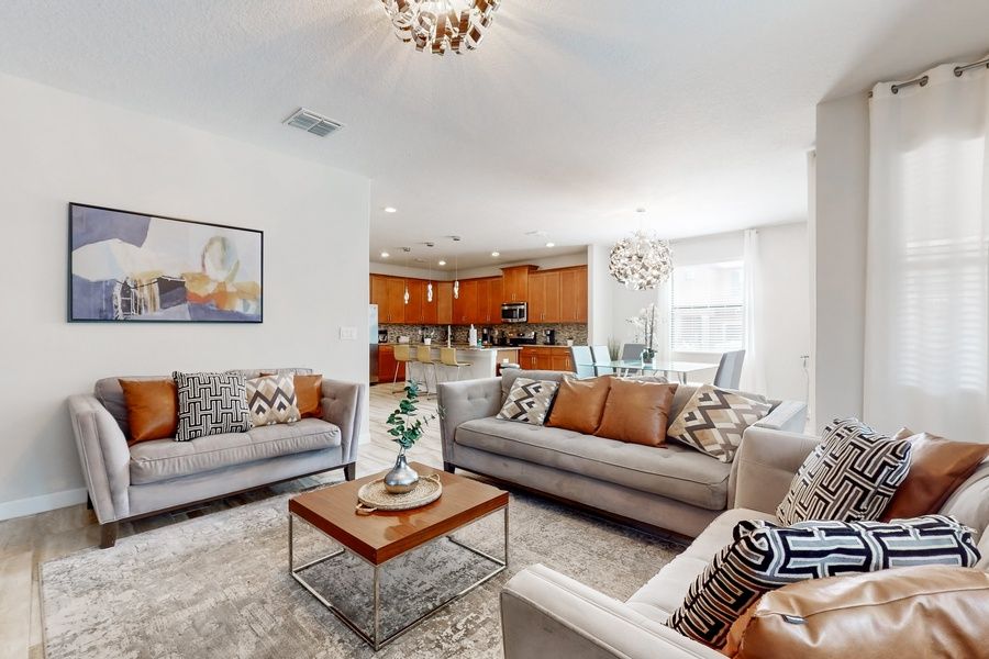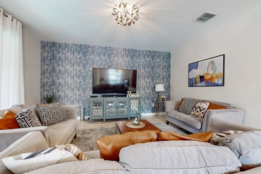Three contemporary sofas set the scene for relaxation in the sophisticated living area. In the evening, settle in to stream a movie on the 75' smart TV. The bonus living area is perfect for kids with its smart TV, video game consoles, a sofa, and fun cushioned recliners. A desk off the living area provides an added convenience.