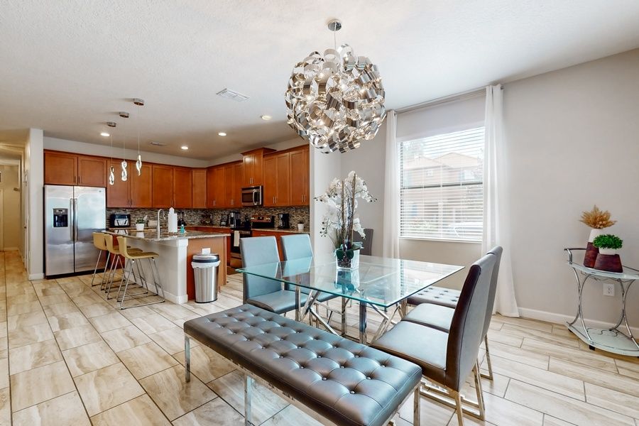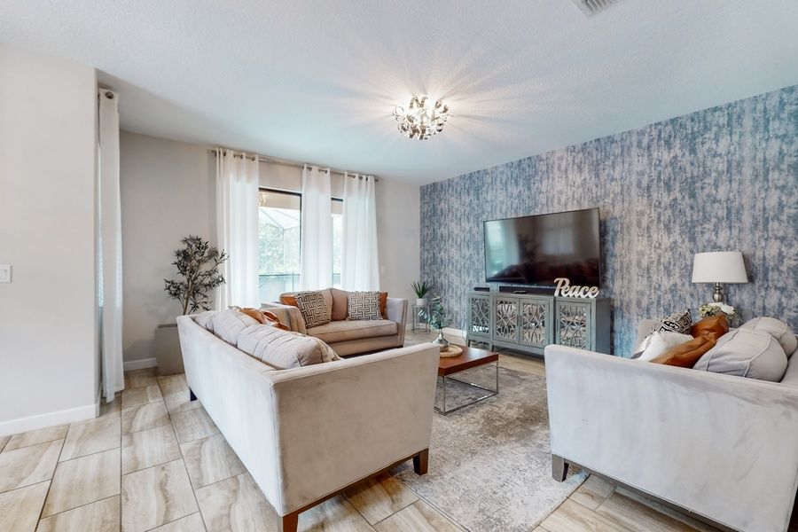 Enjoy the best resort living at this large and lavish home, boasting a private pool and pool spa on a screened lanai, cushioned lounge seating, and alfresco dining. The tots in your group will love the game room, featuring Pac-Man, a Triumph Big Shot II basketball game, and a multi-game console. In the gated Solterra Resort, your superb amenities include a pool with a waterslide, a lazy river, on-site dining, tennis courts, and a state-of-the-art fitness center. The Disney gates are about five minutes away, and Universal is about 20. Shopping and world-class golf are within 10 miles. Additional nearby attractions include Lake Marion and Boggy Creek Airboat Adventures.
