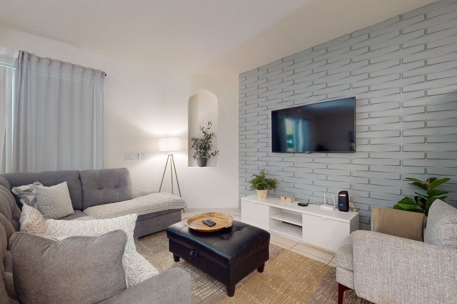 Unwind after fun-filled days in the stylish living area, furnished with a plush sectional and a Roku TV.