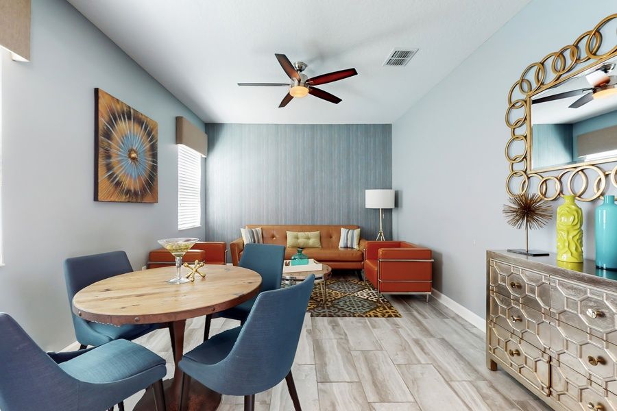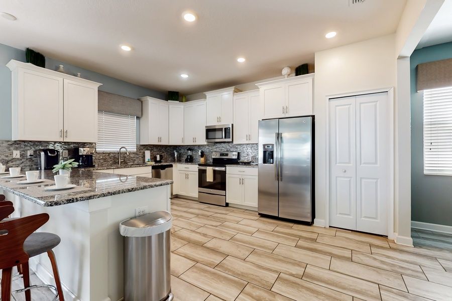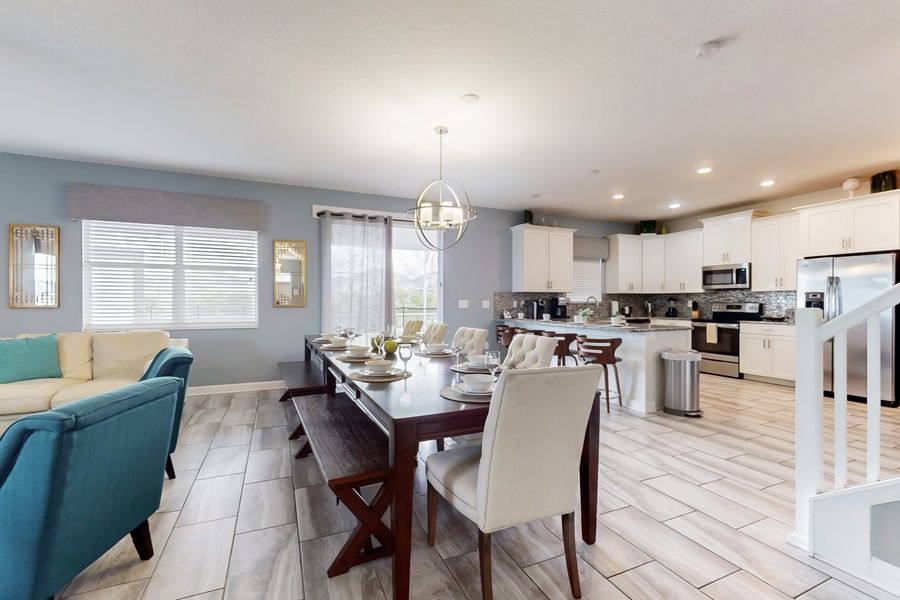 Step into this elegantly appointed home and discover a well-equipped, open-concept kitchen complete with stainless steel appliances to help make meal prep a snap for the visiting chefs in your party. Meet up for formal meals at the adjacent table or step outside onto your shaded patio for the perfect, poolside, alfresco experience.