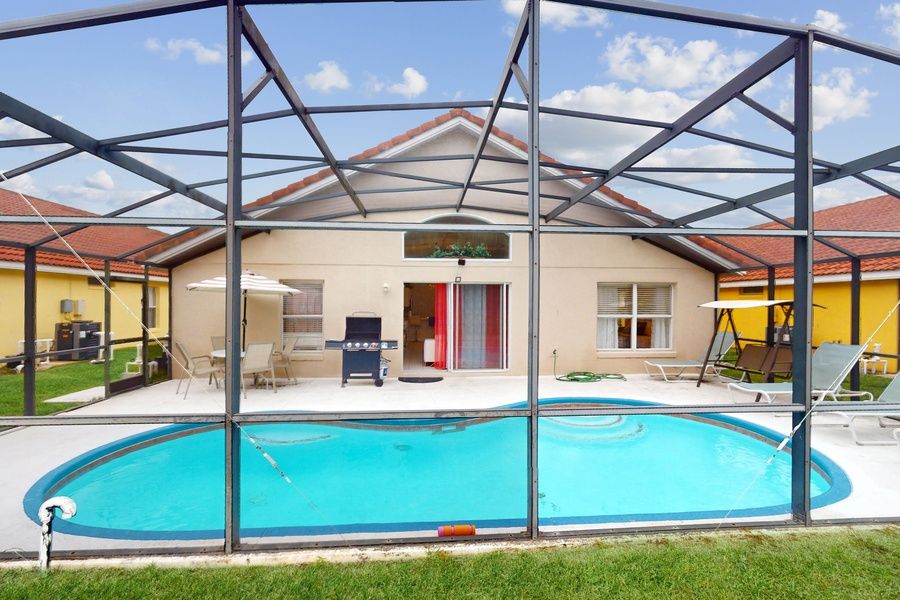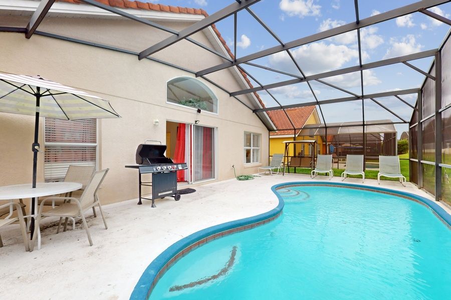 Relax in the private screened pool and patio, perfect for sunny Florida afternoons, outdoor dining, or family barbecues. Inside, you'll find bright open living spaces, a fully equipped kitchen, comfortable bedrooms, and a fun game room with arcade and pool/Ping-Pong table.
