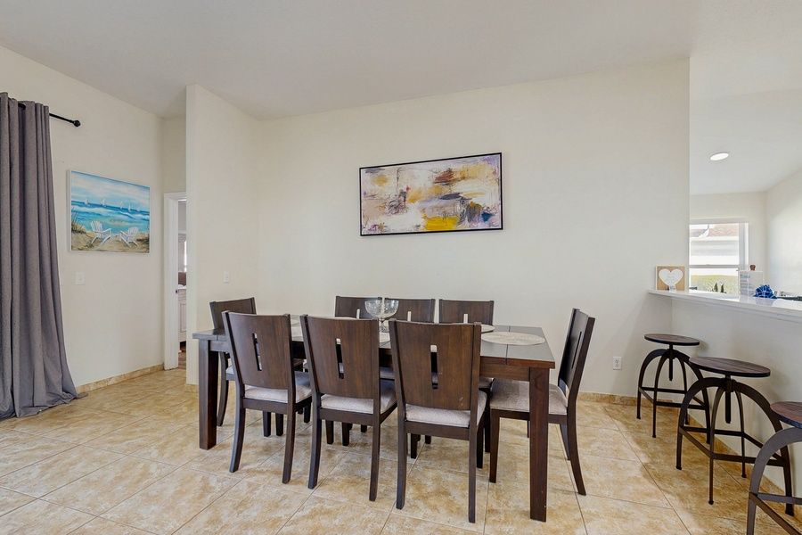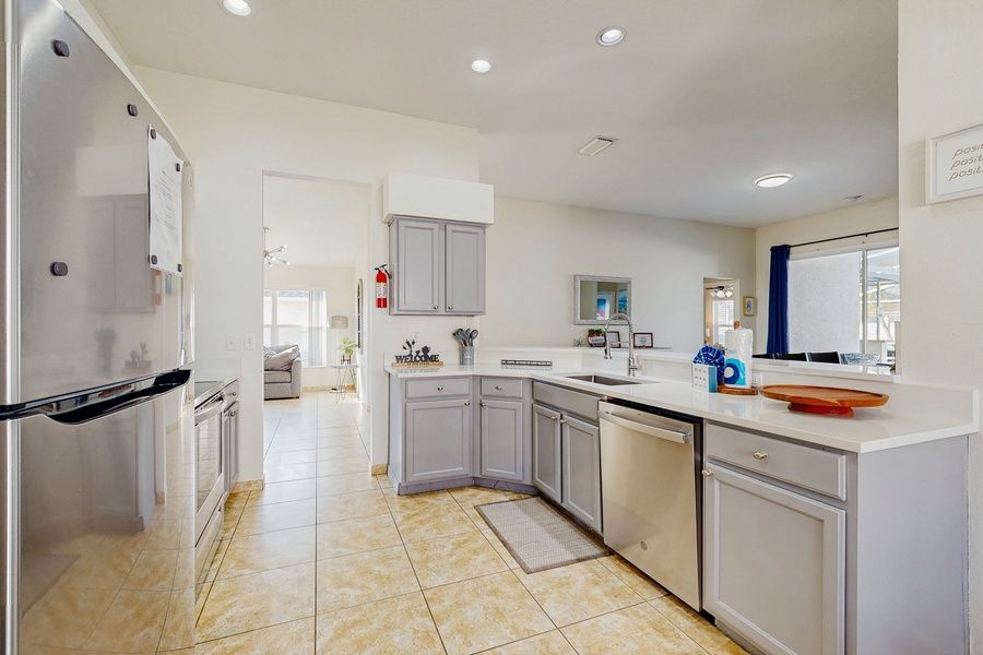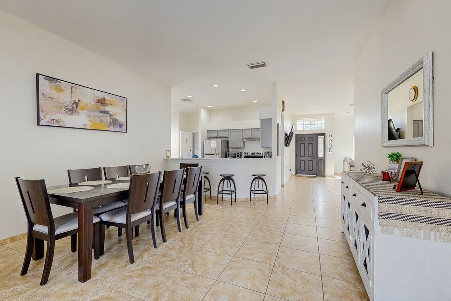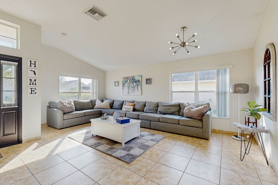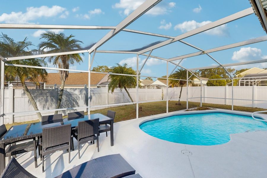 Welcome to your perfect Orlando-area escape! This bright and inviting 3-bedroom, 2-bathroom pool home in the desirable Chatham Park is designed for families seeking comfort and convenience. With a spacious open living and dining layout featuring high ceilings, a cozy family room, and a charming breakfast nook, this single-story home is ideal for gatherings and relaxation after a day of adventure. Step outside to your own private screened-in pool, complete with a wet-bar area on the covered lanai. This tranquil space is perfect for unwinding and soaking up the Florida sun. The master suite offers a spa-style bathroom with a luxurious Jacuzzi tub and a walk-in closet, ensuring a touch of comfort and privacy during your stay. During your stay you'll have access to fantastic amenities, including playgrounds, basketball and tennis courts, and a community pool. The property is conveniently situated near shopping, dining, and major highways, providing easy access to world-famous attractions like Walt Disney World Resort and other Orlando entertainment. Whether you're here for the theme parks, a family vacation, or simply to relax by the pool, this home serves as a stylish and convenient base for a memorable stay in Central Florida. Don't miss out on this opportunity to create lasting memories in this delightful Kissimmee retreat!