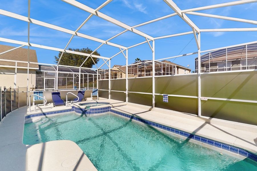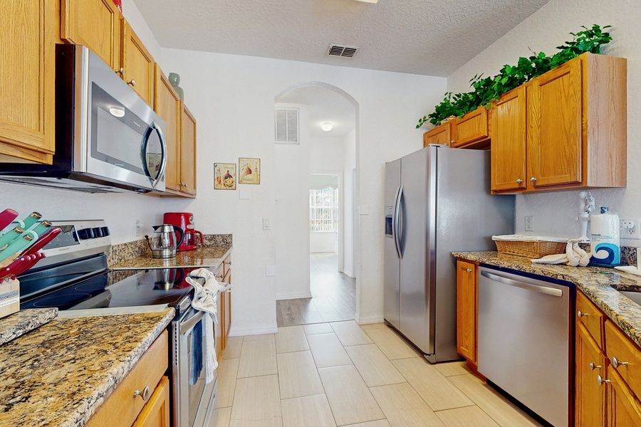 Step inside to discover a bright living area that seamlessly connects to the outdoor screened-in pool and spa through sliding glass doors. The fully equipped kitchen boasts stainless steel appliances and granite countertops, perfect for whipping up meals or snacks before heading out to enjoy the local theme parks. Each bedroom provides ample space for relaxation, while the master suite features a walk-in closet and an ensuite bathroom for added privacy.