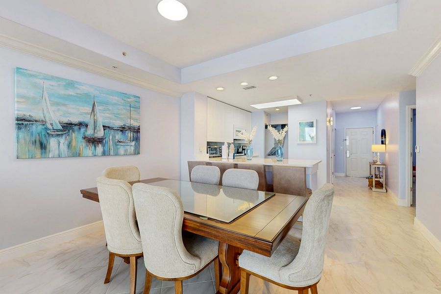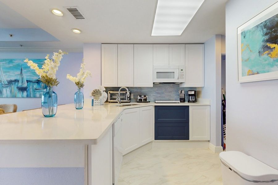 The condo is fully equipped with a modern kitchen complete with all the essentials, including a refrigerator, stove, oven, dishwasher, microwave, and coffee maker. The cozy dining area is perfect for enjoying meals together, and amenities such as air conditioning, Internet, and an in-unit washer and dryer add to your comfort and convenience during your stay.