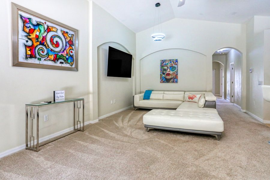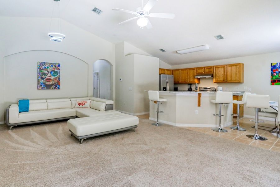 At the rear of this home is where you'll find a large great room set beneath a vaulted ceiling. Prepare meals in the well-equipped, full kitchen with stainless steel appliances and a breakfast bar, a dining table for four for meals, laptops, or family game nights, and a comfortable living area with a large leather sectional and a TV for streaming your favorite channels. If you're craving a little friendly competition, this home also features a converted garage game room with a Ping-Pong table, foosball, and a small pool table.