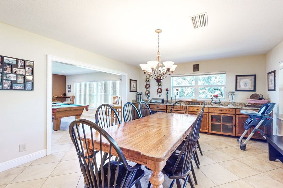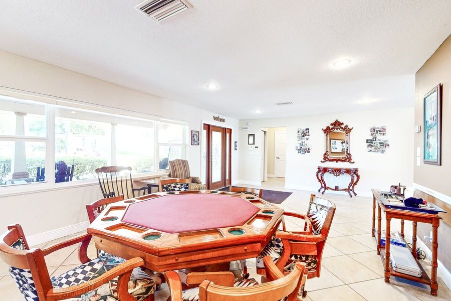 Life is good at the lake when you stay at this gorgeous four-bedroom Lake Placid vacation rental with a private dock, unbeatable lake views, a game room, and dog-friendly accommodations for up to 10 lucky guests. Plan a multi-generational family reunion, a milestone anniversary, or a special birthday in this fabulous home! Dubbed one of Florida's prettiest small towns and named the 'Most Interesting Town in America' by Reader's Digest in 2012, the community of Lake Placid prides itself on its 27 freshwater lakes, community murals, and friendly atmosphere. Spend your days sunbathing at the lake or head into town - it's just five minutes away. There you can view historic locomotives at the Depot Museum, go wine tasting at Henscratch Farms Vineyard and Winery, or play a round of golf at Lake June West Golf Club. The Sunshine State beckons you to explore! This two-story home is inviting with warm lake decor, great natural lighting, and plenty of room to stretch your legs. Host a family meeting in the open-concept living room, which offers a large sectional sofa and gorgeous rock fireplace. Let in the breeze by opening the stylish French doors leading to the patio or turn on the ceiling fans. In-house entertainment includes a TV with Netflix streaming and free WiFi so you can post videos of your first trip around the lake on water skis. A stylish wrap-around breakfast bar with seating for eight divides the living room from the kitchen. The gourmet kitchen is a dream, with granite countertops, stainless steel appliances, handsome tile floors, and a large kitchen island ideal for meal prep. Fry up fish from the lake or prepare a celebratory feast in the gorgeous space that's sure to become the hub of your family activities! Beyond the kitchen is a formal dining room offering a farm chic table for eight, a tasteful chandelier, and a large granite buffet. This space begs to be toasted with champagne glasses and a formal meal. This Lake Placid vacation home was designed with fun in mind! Deal out a game of Blackjack on the poker table which comes complete with lounge chairs and a felt top, or head to the private game room which offers two bar tables, accent seating, and a pool table overlooking the lake. With four bedrooms, a washer and dryer, four full baths, and one half-bath, this vacation home sleeps easily 10 guests and up to two housebroken, well-behaved dogs (though a nightly fee per dog and minimum fee per stay will apply). Sleeping arrangements include two king beds, one queen bed, and eight twin beds. The bedrooms are cozy and ideal for guests of all ages (especially the children's bunk room). Nine beds are located on the lower level (including one king suite), and two master suites are upstairs. The master suites are each immaculate with French doors leading to a private balcony overlooking the lake. Outside, you'll find plenty of green space for Fido to roam, as well as a handsome river-rock patio with exterior columns. Dine outdoors with help from a gas grill and three large patio tables, or snuggle up by the gas fireplace with access from both inside and outside of the home. The private balcony provides a romantic retreat and fenced-in space for both kids and dogs. With additional amenities like a Ping-Pong table and a badminton set, this home has something for everyone. You'll have a secluded beach and an outdoor shower to spritz away all the annoying sand before heading inside. What's nearby: The private dock is serene, offering wooden benches and plenty of space to tie a boat (but please note that the boat lift and jet ski lifts are not available for guest use). Host a diving competition or an impromptu fishing derby before spending the day boating and floating in the sun. Lake Placid is a popular retreat for kayaks, standup paddle-boards, and motorized boats alike. This amazing Florida vacation rental is just too good to pass up. Book a memorable lake trip today!