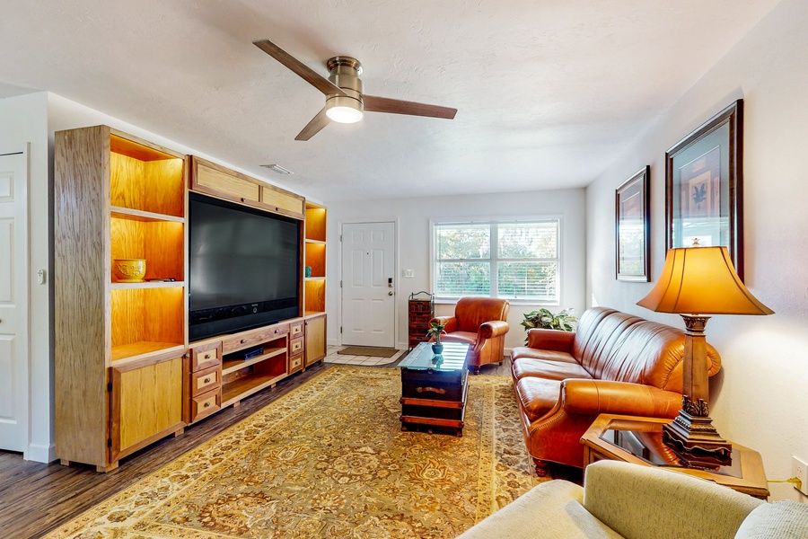 When you are ready to relax, settle down amidst the home's sunny layout. The living room's comfortable seating and large TV lend themselves to morning newscasts and evening movie viewings. Steps from here, the fully equipped kitchen displays stainless steel appliances and ample meal prep space. Both a wicker dining table and a sizable breakfast bar are available for mealtime.