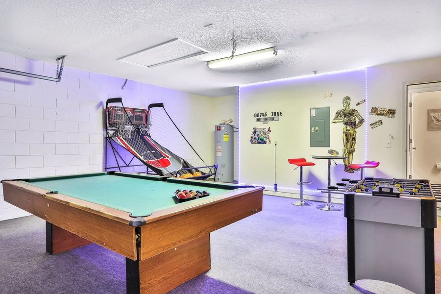 Fun-filled game room with a pool table, foosball, and a two-person basketball hoop game.