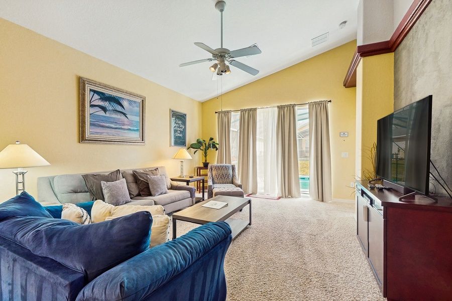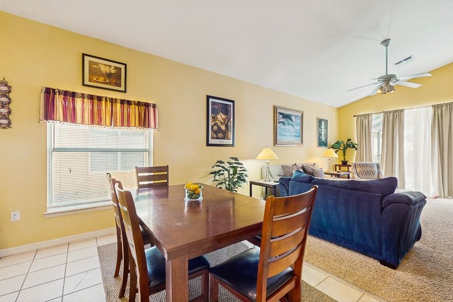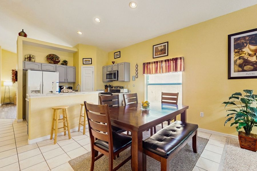 Located in a private gated community less than 20 miles from Walt Disney World Resort, this family-friendly home offers guests the perfect abode for a magical family escape! Delight yourself with a screened-in heated pool in your backyard, the perfect amenity no matter whether you are visiting in the summer or in the winter. The pool area also features plenty of beach and pool chairs for poolside fun and relaxation. Inside, the air-conditioned living area hosts plenty of comfortable sofas surrounding a smart TV with cable, offering a great spot for indoor fun. Speaking of indoor fun, this retreat also offers an air hockey table in the garage. Adjoining the living area is the well-appointed kitchen with all major appliances needed, including a dishwasher. As you continue the tour, you will find a second living area with more comfortable seating and another smart TV with cable. Both living areas are perfect for groups with different interests when it comes to movies and/or TV shows. Planning on packing light? The washer/dryer on site allows you to pack as light as you would like - there is no need to worry about laundry anymore! COMPLEX AMENITIES -Tennis court -Basketball court -Clubhouse -Playground THINGS TO KNOW There is a double futon. There is a high chair available .Pool heating is available from October 1st through May 1st. Pool heating is optional.
