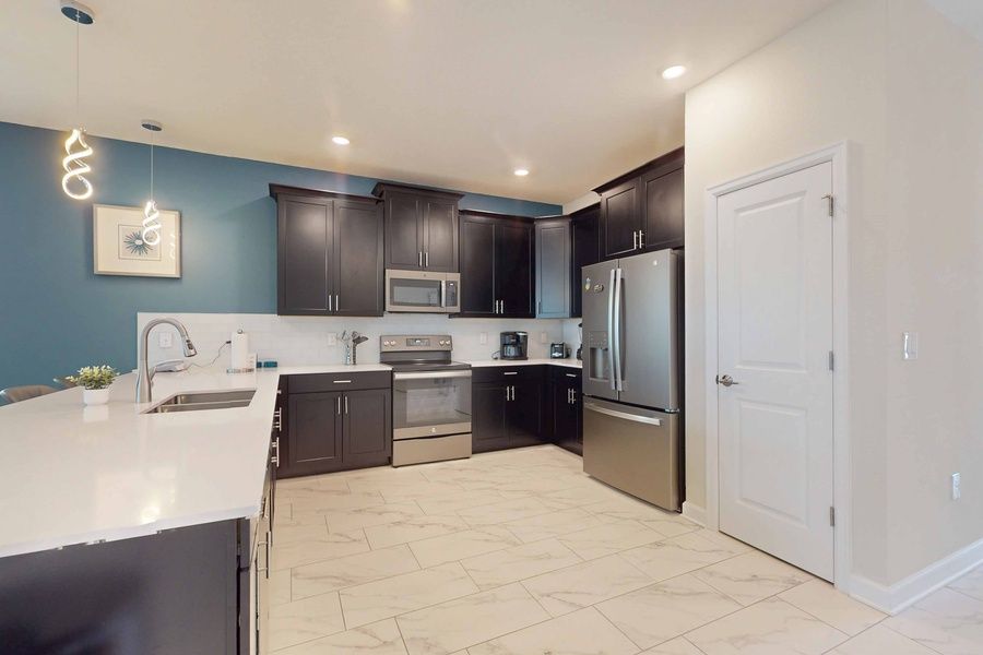 Modern kitchen with stainless steel appliances and open-concept living spaces