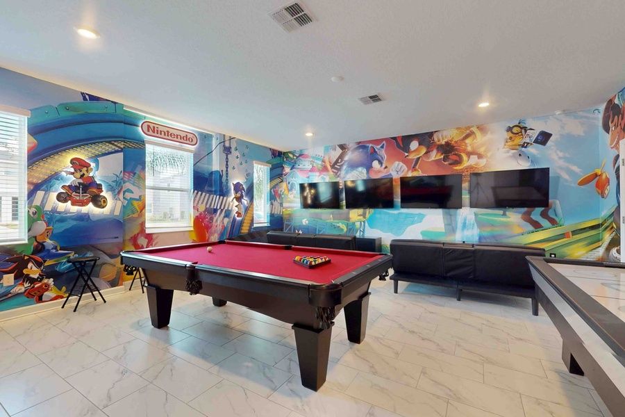Game room with pool table, air hockey, and 2 Playstation and 2 Xbox consoles with controllers available for guest.