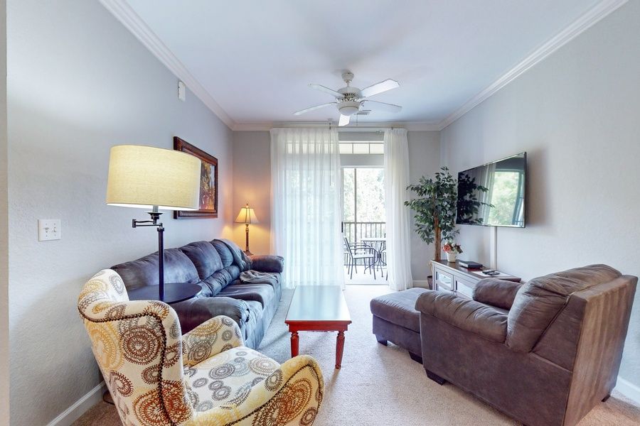 Upon entering this snowbird-friendly home away from home, you will encounter a welcoming open floor plan with an attached enclosed balcony with lawn and tree views and a nice outdoor dining area. The cozy, air-conditioned living room invites you to spread out comfortably and relax. Watch a favorite show or movie on the smart TV with streaming and cable services, share memorable times with your loved ones, or simply unwind and plan your next adventures. The full kitchen is complete with all the essentials to prepare exquisite homemade meals and snacks on the go for the group. A stacked washer/dryer allows you to pack lightly and even plan an extended stay.