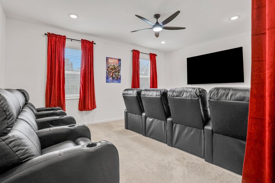 Upstairs is the Marvel-themed in-home movie theatre with eight comfy theatre chairs and an enormous smart TV with a sound bar. There are four additional bedrooms on this level - one of them is a bunk room with Marvel-themed decor, making it ideal for the kiddos! All bedrooms have en suite bathrooms.