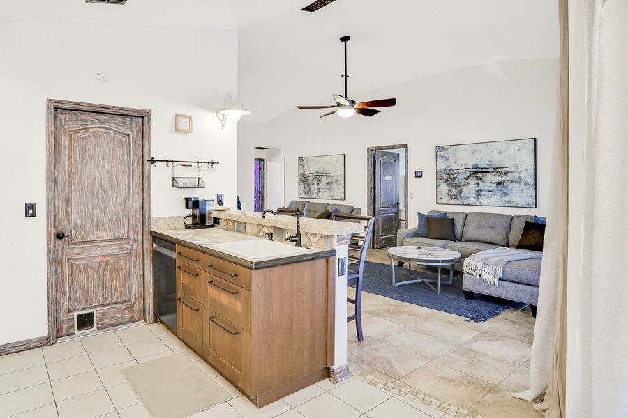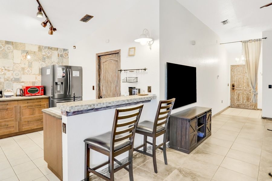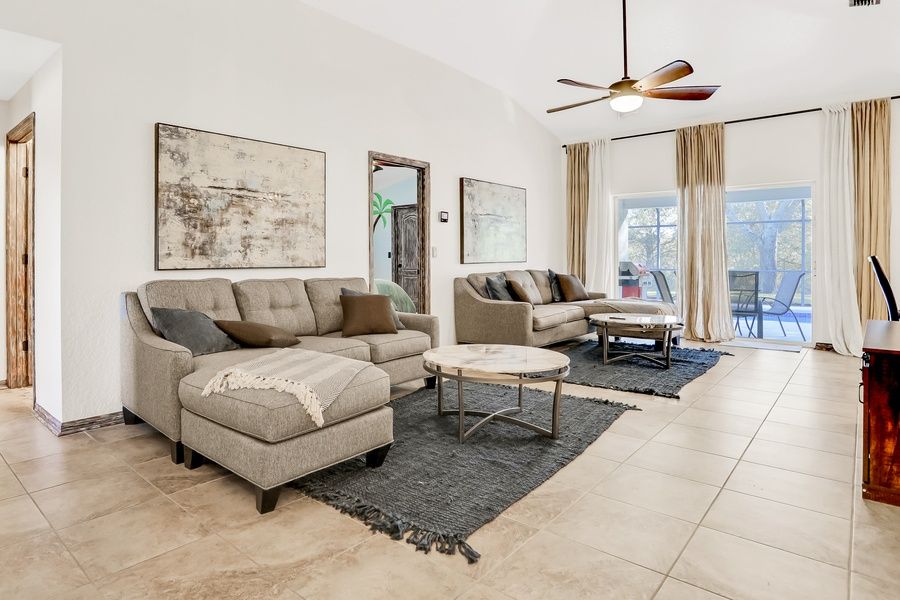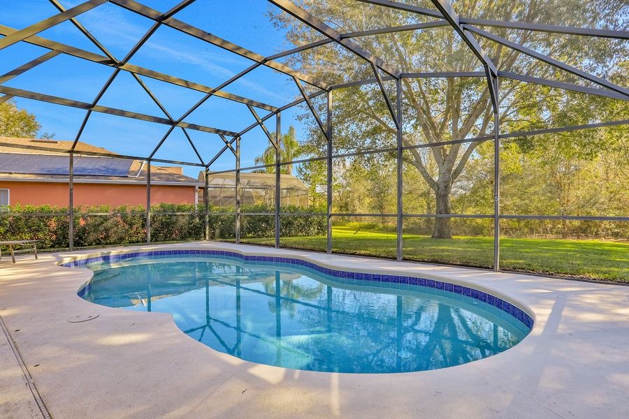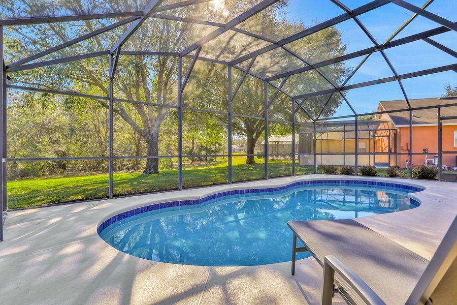 A true focal point of the home is the gorgeous enclosed patio. Equipped with a pool, grill, and a comfortable seating area, this space is begging to be enjoyed! Also during your stay, start your mornings with peaceful walks around the community park and pond, chatting with those you love as you plan the day's agenda.