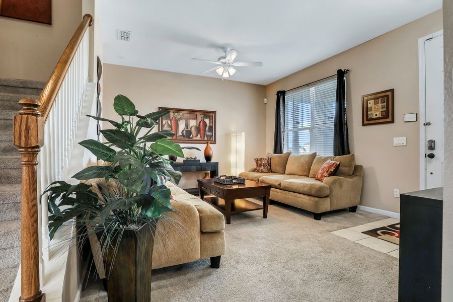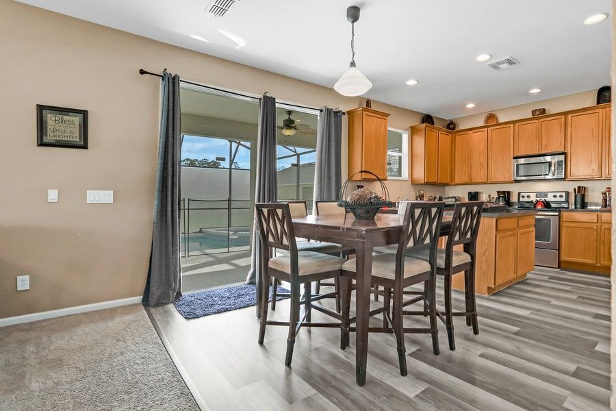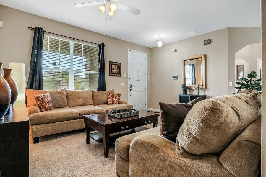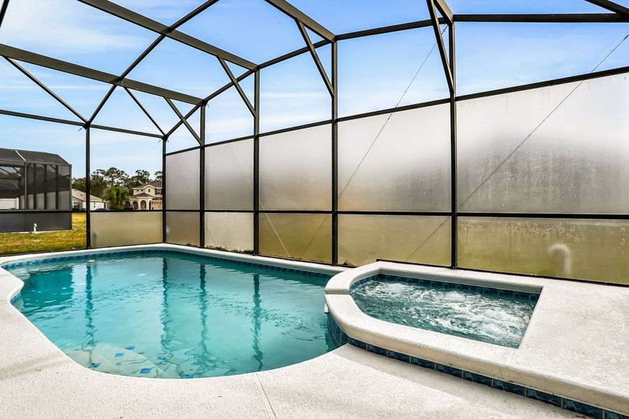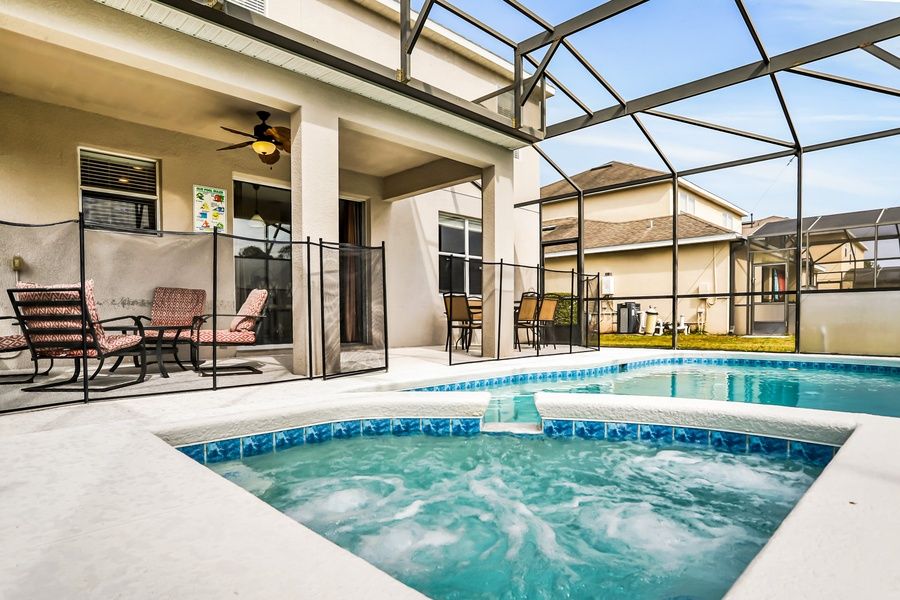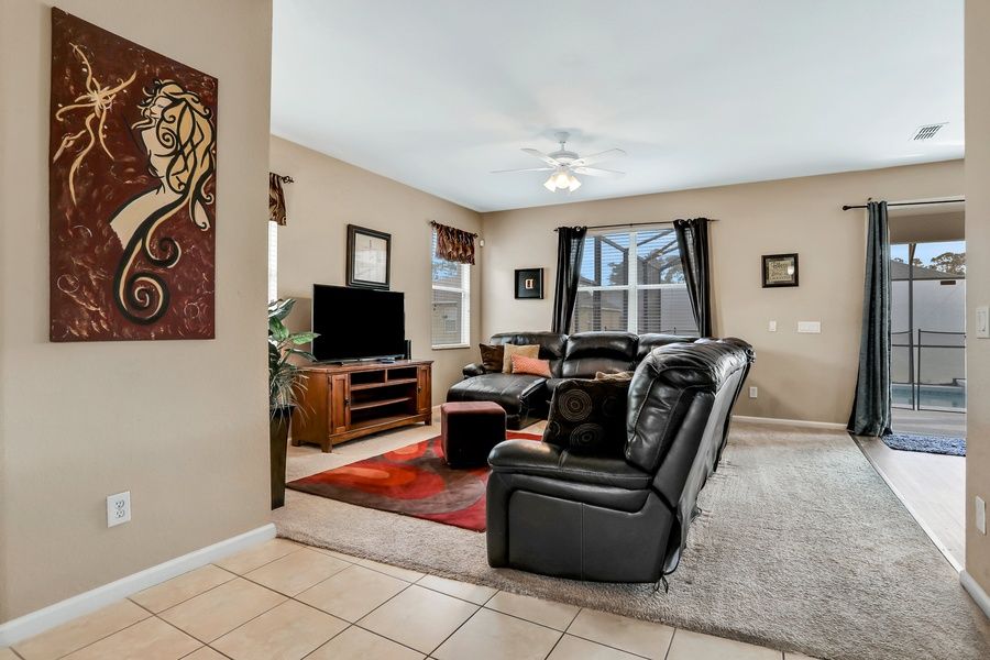 Less than 15 miles south of Walt Disney World Resort, this two-level, five-bedroom Kissimmee house is the ideal place to experience a fun-filled theme park adventure with the family! The kids will love the two upstairs Disney-themed rooms, and you'll have three more luxurious rooms to enjoy, two of them with en-suite baths. The lower-level living space is open and spacious, with lots of comfortable furniture, attractive decors, and tile and carpeted floors. The entertainment area features a large flatscreen TV surrounded by ample seating, ideal for movie nights with friends and family. The full kitchen has all the appliances and counter space you need to prepare a wonderful meal, and you can serve your dinner guests at the dining table or out on the furnished screened-in patio for an al-fresco dining experience. After a fun day of sightseeing, come home to splash around in the expansive private pool then use the free WiFi to research tomorrow's next adventure. The central AC will ensure everything stays nice and cool during those hot summer days, and you can take advantage of the private washer/dryer to keep the gang looking their best during your stay.
