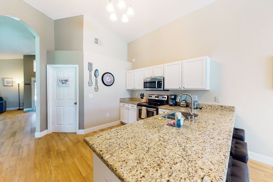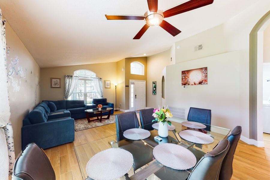 Sun-soaked fun and contemporary comfort close to theme parks, golf, and Orlando area attractions are yours at this home in the gated community of the Manors at Westridge. Complete with private highlights like a screened pool and attached spa, the home boasts an unbeatable central location within 12 miles of Disney parks and minutes from great golf destinations like Highlands Reserve, ChampionsGate, and Reunion. The home's spacious interior is fully furnished for family living, with perks including two, playfully themed kid's bedrooms.