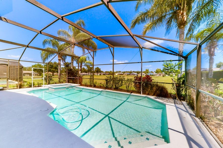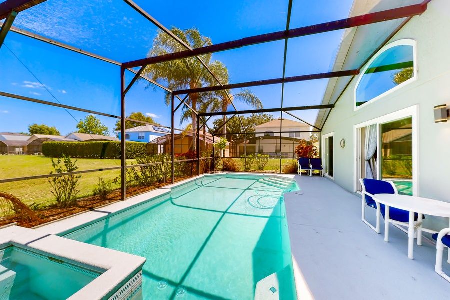 The pool/spa area is completely screened to keep the cool breezes in and the bugs out, and patio seating is provided for added outdoor leisure.